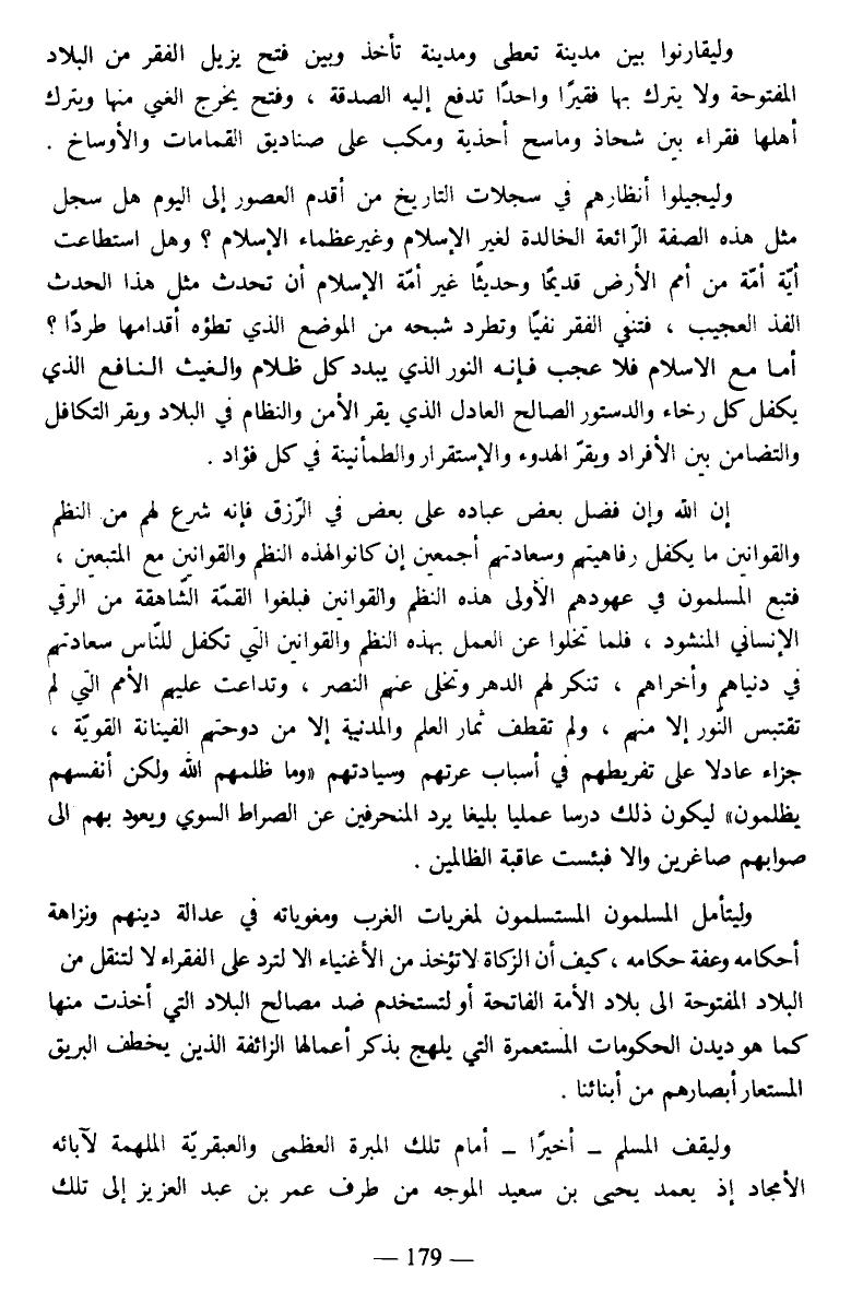 مثل هذه الصفة الرائعه الخالدة لغير الإسلام وغير عظماء الإسلام؟ وهل استطاعت أية أمة من أمم الأرض قديما وحديثا غير أمة الإسلام أن تحدث مثل هذا الحدث الفذ العجيب، فتنفي الفقر نفيا وتطرد شبحه من الموضع الذي تطؤه أقدامها طردا؟ أما مع الإسلام فلا عجب فإنه النور الذي سدد كل ظلام والغيث النافع الذي يكفل كل رخاء والدستور الصالح العادل الذي يقر الأمن والنظام في البلاد ويقر التكافل والتضامن بين الأفراد ويقر الهدوء والإستقرار والطمأنينة في كل فؤاد.