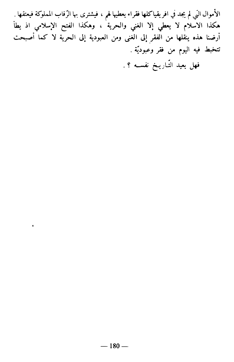 الأموال التي لم يجد في إفريقيا كلها فقراء يعطيها لهم، فيشتري بها الرقاب المملوكة فيعتقها. هكذا الإسلام لا يعطي إلا الغني والحرية، وهكذا الفتح الإسلامي إذ يطأ أرضنا هذه ينقلها من الفقر إلى الغنى ومن العبودية إلى الحرية لا كما أصبحت تتخبط فيه اليوم من فقر وعبودية.