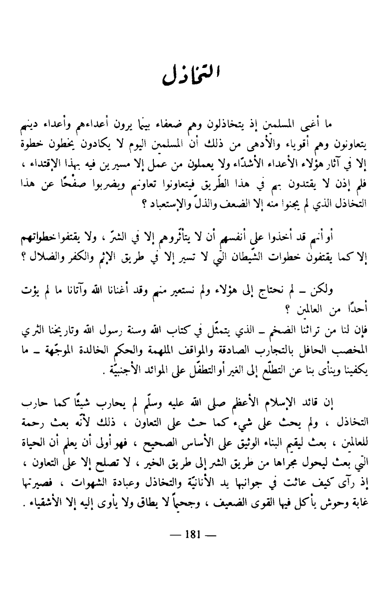 إن قائد الإسلام الأعظم صلى الله عليه وسلم لم يحارب شيئا كما حارب التخاذل، ولم يحث على شيء كما حث على التعاون، ذلك لأنه بعث رحمة للعالمين، بعث ليقيم البناء الوثيق على الأساس الصحيح، فهو أولى أن يعلم أن الحياة التي بعث ليحول مجراها من طريق الشر إلى طريق الخير، لا تصلح إلا على التعاون، إذ رآى كيف عاثت في جوانبها يد الأنانية والتخاذل وعبادة الشهوات، فصيرتها غابة وحوش يأكل فيها القوي الضعيف، وجحيما لا يطاق ولا يأوى إليه إلا الأشقياء.