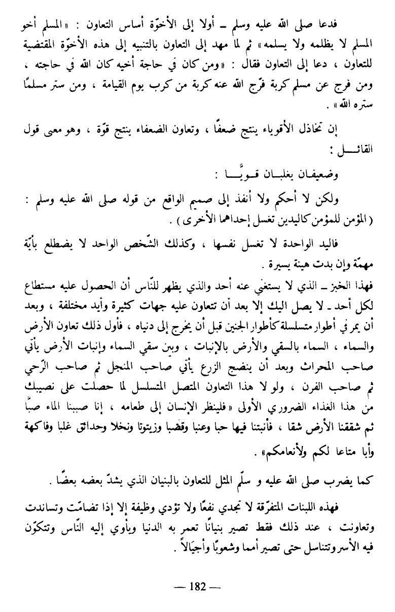 فهذا الخبز- الذي لا يستغي عنه أحد والذي يظهر للناس أن الحصول عليه مستطاع لكل أحد- لا يصل إليك إلا بعد أن تتعاون عليه جهات كثيرة وأيد مختلفة، وبعد أن يمر في أطوار متسلسلة كأطوار الجنين قبل أن يخرج إلى دنياه، فأول ذلك تعاون الأرض والسماء، السماء بالسقي والأرض بالإنبات، وبين سقي السماء وإنبات الأرض يأتي صاحب المحراث وبعد أن ينضج الزرع يأتي صاحب المنجل ثم صاحب الرحي ثم صاحب الفرن، ولولا هذا التعاون المتصل المتسلسل لما حصلت على نصيبك من هذا الغذاء الضروري الأولى {فَلْيَنْظُرِ الْإِنْسَانُ إِلَى طَعَامِهِ * أَنَّا صَبَبْنَا الْمَاءَ صَبًّا * ثُمَّ شَقَقْنَا الْأَرْضَ شَقًّا * فَأَنْبَتْنَا فِيهَا حَبًّا * وَعِنَبًا وَقَضْبًا * وَزَيْتُونًا وَنَخْلًا * وَحَدَائِقَ غُلْبًا * وَفَاكِهَةً وَأَبًّا * مَتَاعًا لَكُمْ وَلِأَنْعَامِكُمْ}.