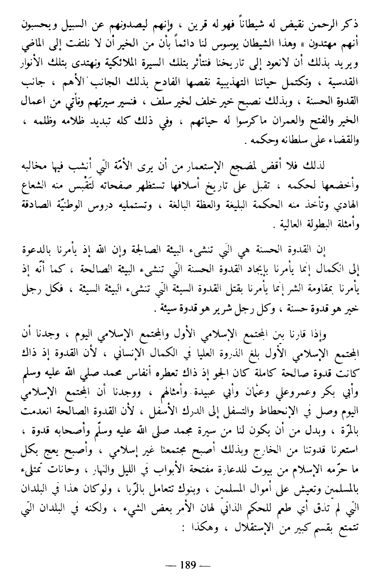 وإذا قارنا بين المجتمع الإسلامي الأول والمجتمع الإسلامي اليوم، وجدنا أن المجتمع الإسلامي الأول بلغ الذروة العليا في الكمال الإنساني، لأن القدوة إذ ذاك كانت قدوة صالحة كاملة كان الجو إذ ذاك تعطره أنفاس محمد صلى الله عليه وسلم وأبي بكر وعمر وعلي وعثمان وأبي عبيدة وأمثالهم، ووجدنا أن المجتمع الإسلامي اليوم وصل في الإنحطاط والتسفل إلى الدرك الأسفل، لأن القدوة الصالحة انعدمت بالمرة، وبدل من أن يكون لنا من سيرة محمد صلى الله عليه وسلم وأصحابه قدوة، استعرنا قدوتنا من الخارج وبذلك أصبح مجتمعنا غير إسلامي، وأصبح يعج بكل ما حرمه الإسلام من بيوت للدعارة مفتحة الأبواب في الليل والنهار، وحانات تمتلىء بالمسلمين وتعيش على أموال المسلمين، وبنوك تتعامل بالربا، ولو كان هذا في البلدان التي لم تذق أي طعم للحكم الذاتي لهان الأمر بعض الشيء، ولكنه في البلدان التي تتمتع بقسم كبير من الإستقلال، وهكذا: