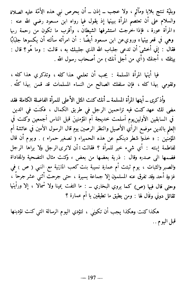 واذكري- أيتها المرأة المسلمة- أنك كنت المثل الأعلى للمرأة الفاضلة الكاملة فقد مضى لك عهد كنت فيه تزاحمين الرجل في طريق الكمال، فكنت في الدين في السابقين الأولين يوم أسلمت خديجة أم المؤمنين قبل الناس أجمعين وكنت في العلم بالدين موضع الرأي الأصيل والنظر الرصين يوم قال الرسول الأمين في عائشة أم المؤمنين: "خذوا شطر دينكم عن هذه الحميراء" (تصغير حمراء). ويوم أن قال لفاطمة إبنته: أي شيء خير للمرأة؟ فقالت: أن لا ترى الرجل ولا يراها الرجل فضمها إلى صدره وقال: ذرية بعضها من بعض"، وكنت مثال التضحية والمفاداة والصبر والثبات، يوم ثبتت أم عمارة نسيبة بنت كعب المازنية مع النبي صلى الله عليه وسلم في غزوة أحد وقد تفرق عنه المسلمون إلا جماعة يسيرة، حتى جرحت أثثى عشر جرحا، وحتى قال فيها صلى الله عليه وسلم كما يروي البخاري-: ما التفت يمينا ولا شمالا، إلا ورأيتها تقاتل دوني وقال لها: ومن يطيق ما تطيقين يا أم عمارة؟