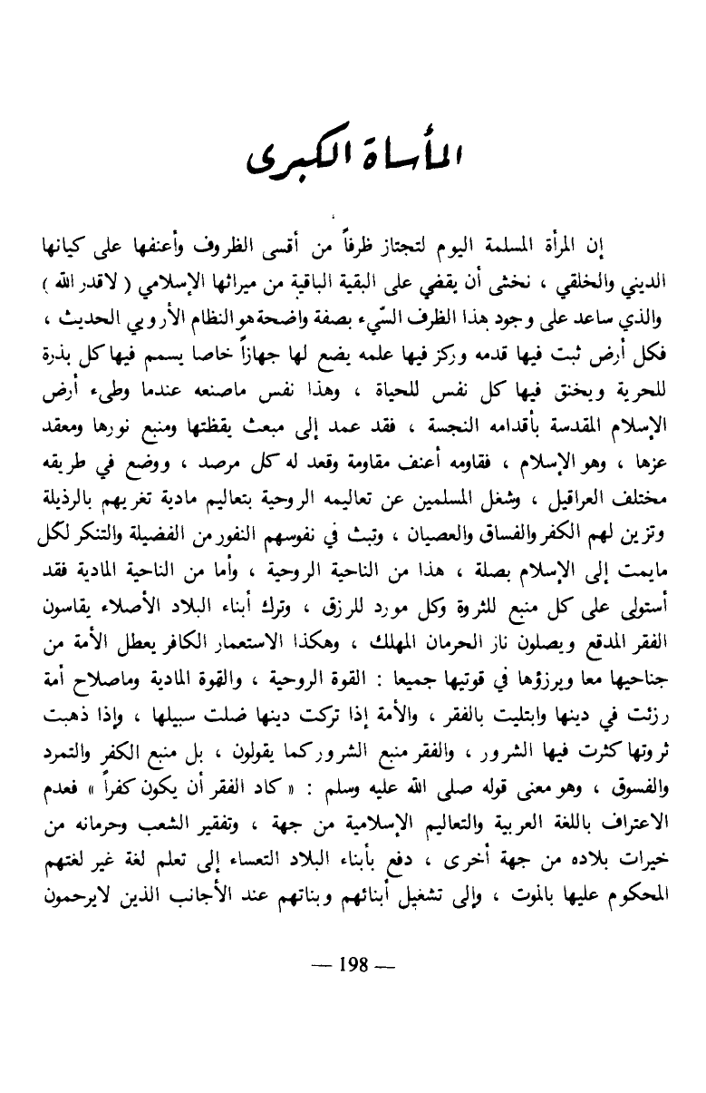 إن المرأه المسلمة اليوم لتجتاز ظرفا من أقسى الظروف وأعنفها على كيانها الديني والخلقي، نخشى أن يقضي على البقية الباقية من ميراثها الإسلامي (لا قدر الله) والذي ساعد على وجود هذا الظرف السيء بصفة واضحة هو النظام الأروبي الحديث، فكل أرض ثبت فيها قدمه وركز فيها علمه يضع لها جهازا خاصا يسمم فيها كل بذرة للحرية ويخنق فيها كل نفس للحياة، وهذا نفس ما صنعه عندما وطىء أرض الإسلام المقدسة بأقدامه النجسة، فقد عمد إلى مبعث يقظتها ومنبع نورها ومعقد عزها، وهو الإسلام، فقاومه أعنف مقاومة وقعد له كل مرصد، ووضع في طريقه مختلف العراقيل، وشغل المسلمين عن تعاليمه إلروحية بتعاليم مادية تغريهم بالرذيلة وتزين لهم الكفر والفسوق والعصيان، وتبث في نفوسهم النفور من الفضيلة والتنكر لكل ما يمت إلى الإسلام بصلة، هذا من الناحية الروحية، وأما من الناحية المادية فقد أستولى على كل منبع للثروة وكل مورد للرزق، وترك أبناء البلاد الأصلاء يقاسون الفقر المدقع ويصلون نار الحرمان المهلك، وهكذا الاستعمار الكافر يعطل الأمة من جناحيها معا ويرزؤها في قوتيها جميعا: القوة الروحية، والقوة المادية وما صلاح أمة رزئت في دينها وأبتليت بالفقر، والأمة إذا تركت دينها ضلت سبيلها، وإذا ذهبت ثروتها كثرت فيها الشرور، والفقر منبع الشرور كما يقولون، بل منبع الكفر والتمرد والفسوق، وهو معنى قوله صلى الله عليه وسلم: "كاد الفقر أن يكون كفرا" فعدم الاعتراف باللغة العربية والتعاليم الإسلامية من جهة، وتفقير الشعب وحرمانه من خيرات بلاده من جهة أخرى، دفع بأبناء البلاد التعساء إلى تعلم لغة غير لغتهم المحكوم عليها بالموت، وإلى تشغي أبنائهم وبناتهم عند الأجانب الذين لا يرحمون