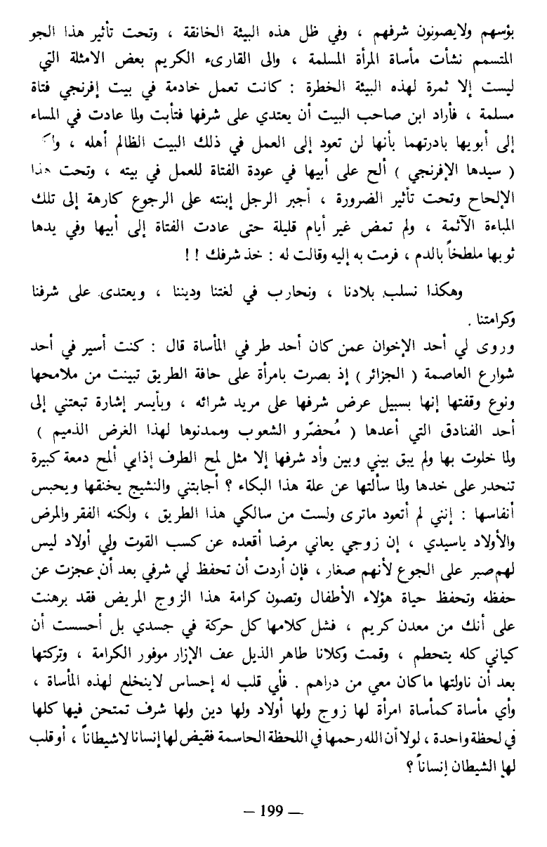 وروى لي أحد الإخوان عمن كان أحد طرفي المأساة قال: كنت أسير في أحد شوارع العاصمة (الجزائر) إذ بصرت بامرأة على حافة الطريق تبينت من ملامحها ونوع وقفتها إنها بسبيل عرض شرفها على مريد شرائه، وبأيسر إشارة تبعتني إلى أحد الفنادق التي أعدها (محضرو الشعوب وممدنوها لهذا الغرض الذميم) ولما خلوت بها ولم يبق بيني وبين وأد شرفها إلا مثل لمح الطرف إذا بي ألمح دمعة كبيرة تنحدر على خدها ولما سألتها عن علة هذا البكاء؟ أجابتني والنشيج يخنقها ويحبس أنفاسها: إنني لم أتعود ما ترى ولست من سالكي هذا الطريق، ولكنه الفقر والمرض والأولاد ياسيدي، إن زوجى يعاني مرضا أقعده عن كسب القوت ولي أولاد ليس لهم صبر على الجوع لأنهم صغار، فإن أردت أن تحفظ لي شرفي بعد أن عجزت عن حفظه وتحفظ حياة هؤلاء الأطفال وتصون كرامة هذا الزوج المريض فقد برهنت على أنك من معدن كريم، فشل كلامها كل حركة في جسدي بل أحسست أن كياني كله يتحطم، وقمت وكلانا طاهر الذيل عف الإزار موفور الكرامة، وتركتها بعد أن ناولتها ما كان معي من دراهم. فأي قلب له إحساس لا ينخلع لهذه المأساة، وأي مأساة كمأساة امرأة لها زوج ولها أولاد ولها دين ولها شرف تمتحن فيها كلها في لحظة واحدة، لولا أن الله رحمها في اللحظة الحاسمة فقيض لها إنسانا لا شيطانا، أو قلب لها الشيطان إنسانا؟