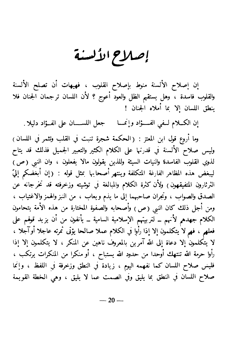 وما أروع قول ابن المعتز: (الحكمة شجرة تنبت في القلب وتثمر في اللسان) وليس صلاح الألسنة في قدرتها على الكلام الكثير والتعبير الجميل فذلك قد يتاح لذوي القلوب الفاسد والنيات السعيئة وللذين يقولون ما لا يفعلون، وأن النبي صلى الله عليه وسلم ليبغض هذه المظاهر الفارغة المتكلفة وينتهر أصحابها بمثل قوله: (إن أبغضكم إلي الثرثارون المتفيقهون) ولأن كثرة الكلام والمبالغة في توشيته وزخرفته قد تخرجانه عن الصدق والصواب، وتجران صاحبهما إلى ما يذم ويعاب، من النبز والهمز والاغتياب، ومن أجل ذلك كان النبي صلى الله عليه وسلم وأصحابه والصفوة المختارة من هذه الأمة يتحامون الكلام جهدهم لأنهم- لتربيتهم الإسلامية السامية- يأنفون من أن يزيد قولهم على فعلهم، فهم لا يتكلمون إلا إذا رأوا في الكلام عملا صالحا يؤتي ثمرته عاجلا أو آجلا، لا يتكلمون إلا دعاة إلى الله آمرين بالمعروف ناهين عن المنكر، لا يتكلمون إلا إذا رأوا حرمة الله تنتهك أو حدا من حدود الله يستباح، أو منكرا من المنكرات يرتكب، فليس صلاح اللسان كما نفهمه اليوم، زيادة في النطق وزخرفة في اللفظ، وإنما صلاح اللسان في النطق بما يليق وفي الصمت عما لا يليق، وهي الخطة القويمة