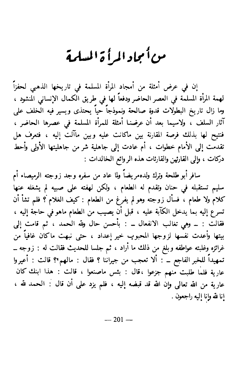 إن في عرض أمثلة من أمجاد المرأة المسلمة في تاريخها الذهبي لحفزا لهمة المرأة المسلمة في العصر الحاضر ودفعا لها في طريق الكمال الإنساني المنشود، وما زال تاريخ البطولات قدوة صالحة ونموذجا حيا يحتذى ويسير فيه الخلف على آثار السلف، ولاسيما بعد أن عرضنا أمثلة للمرأة المسلمة في عصرها الحاضر، فنتيح لها بذلك فرصة المقارنة بين ما كانت عليه وبين ما آلت إليه، فتعرف هل تقدمت إلى الأمام خطوات، أم عادت إلى جاهلية شر من جاهليتها الأولى وأحط دركات، وإلى القارئين والقارئات هذه الروائع الخالدات: