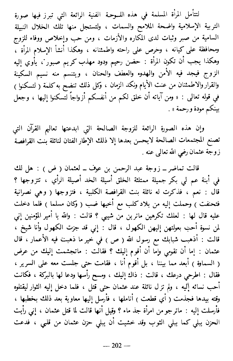 وإن هذه الصورة الرائعة للزوجة الصالحة التي أبدعتها تعاليم القرآن التي تصنع المجتمعات الصالحة لا يحسن بعدها إلا ذلك الإطار الفتان لنائلة بنت القرافصة زوجه عثمان رضي الله تعالى عنه.