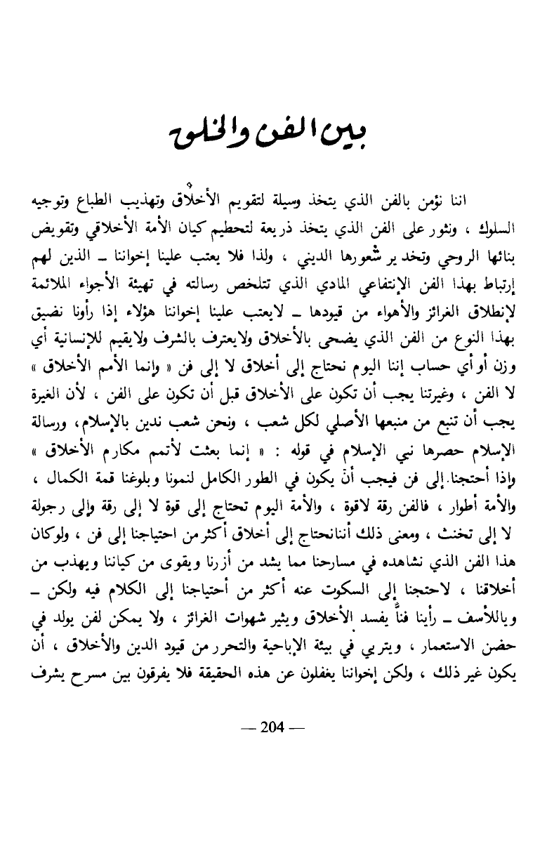 إننا نؤمن بالفن الذي يتخذ وسيلة لتقويم الأخلاق وتهذيب الطباع وتوجيه السلوك، ونثور على الفن الذي يتخذ ذريعة لتحطيم كيان الأمة الأخلاقي وتقويض بنائها الروحي وتخدير شعورها الديني، ولذا فلا يعتب علينا إخواننا- الذين لهم إرتباط بهذا الفن الإنتفاعي المادي الذي تتلخص رسالته في تهيئة الأجواء الملائمة لانطلاق الغرائز والأهواء من قيودها- لا يعتب علينا إخواننا هؤلاء إذا رأونا نضيق بهذا النوع من الفن الذي يضحي بالأخلاق ولا يعترف بالشرف ولا يقيم للإنسانية أي وزن أو أي حساب إننا اليوم نحتاج إلى أخلاق لا إلى فن "وإنما الأمم الأخلاق" لا الفن، وغيرتنا يجب أن تكون على الأخلاق قبل أن تكون على الفن، لأن الغيرة يجب أن تنبع من منبعها الأصلي لكل شعب، ونحن شعب ندين بالإسلام، ورسالة الإسلام حصرها نبي الإسلام في قوله: "إنما بعثت لأتمم مكارم الأخلاق" وإذا أحتجنا إلى فن فيجب أن يكون في الطور الكامل لنمونا وبلوغنا قمة الكمال، والأمة أطوار، فالفن رقة لا قوة، والأمة اليوم تحتاج إلى قوة لا إلى رقة وإلى رجولة لا إلى تخنث، ومعنى ذلك أننا نحتاج إلى أخلاق أكثر من احتياجنا إلى فن، ولو كان هذا الفن الذي نشاهده في مسارحنا مما يشد من أزرنا ويقوي من كياننا ويهذب من أخلاقنا، لاحتجنا إلى السكوت عنه أكثر من أحتياجنا إلى الكلام فيه ولكن- وياللأسف- رأينا فنا يفسد الأخلاق ويثير شهوات الغرائز، ولا يمكن لفن يولد في حضن الاستعمار، ويتربى في بيئة الإباحية والتحرر من قيود الدين والأخلاق، أن يكون غير ذلك، ولكن إخواننا يغفلون عن هذه الحقيقة فلا يفرقون بين مسرح يشرف