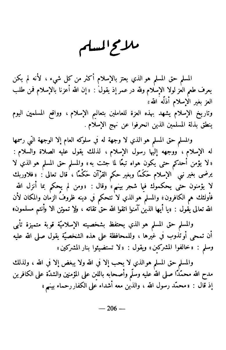 والمسلم حق المسلم هو الذي لا وجهة له في سلوكه العام إلا الوجهة التي رسمها له الإسلام، ووجهه إليها رسول الإسلام، لذلك يقول عليه الصلاة والسلام: "لا يؤمن أحدكم حتى يكون هواه تبعا لما جئت به" والمسلم حق المسلم هو الذي لا يرضى بغير نبي الإسلام حكما وبغير حكم القرآن حكما، قال تعالى: {فَلَا وَرَبِّكَ لَا يُؤْمِنُونَ حَتَّى يُحَكِّمُوكَ فِيمَا شَجَرَ بَيْنَهُمْ} وقال: {وَمَنْ لَمْ يَحْكُمْ بِمَا أَنْزَلَ اللَّهُ فَأُولَئِكَ هُمُ الْكَافِرُونَ} والمسلم هو الذي لا تتحكم في دينه ظروف الزمان والمكان لأن الله تعالى يقول: {يَا أَيُّهَا الَّذِينَ آمَنُوا اتَّقُوا اللَّهَ حَقَّ تُقَاتِهِ وَلَا تَمُوتُنَّ إِلَّا وَأَنْتُمْ مُسْلِمُونَ}.