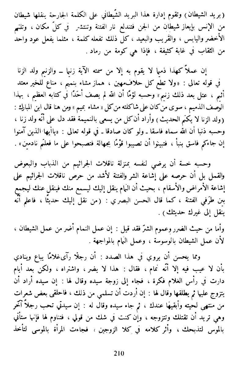 (بريد الشيطان) وتقوم إداره هذا البريد الشيطاني على الكلمة الجارجة ينقلها شيطان من الإنس بإيعاز شيطان من الجن فتندلع نار الفتنة وتنتشر في كل مكان، وتلتهم الأخضر واليابس، والقريب والبعيد، كل ذلك تفعله كلمة، مثلما يفعل عود واحد من الثقاب في غابة كثيفة، فإذا هي كومة من رماد.