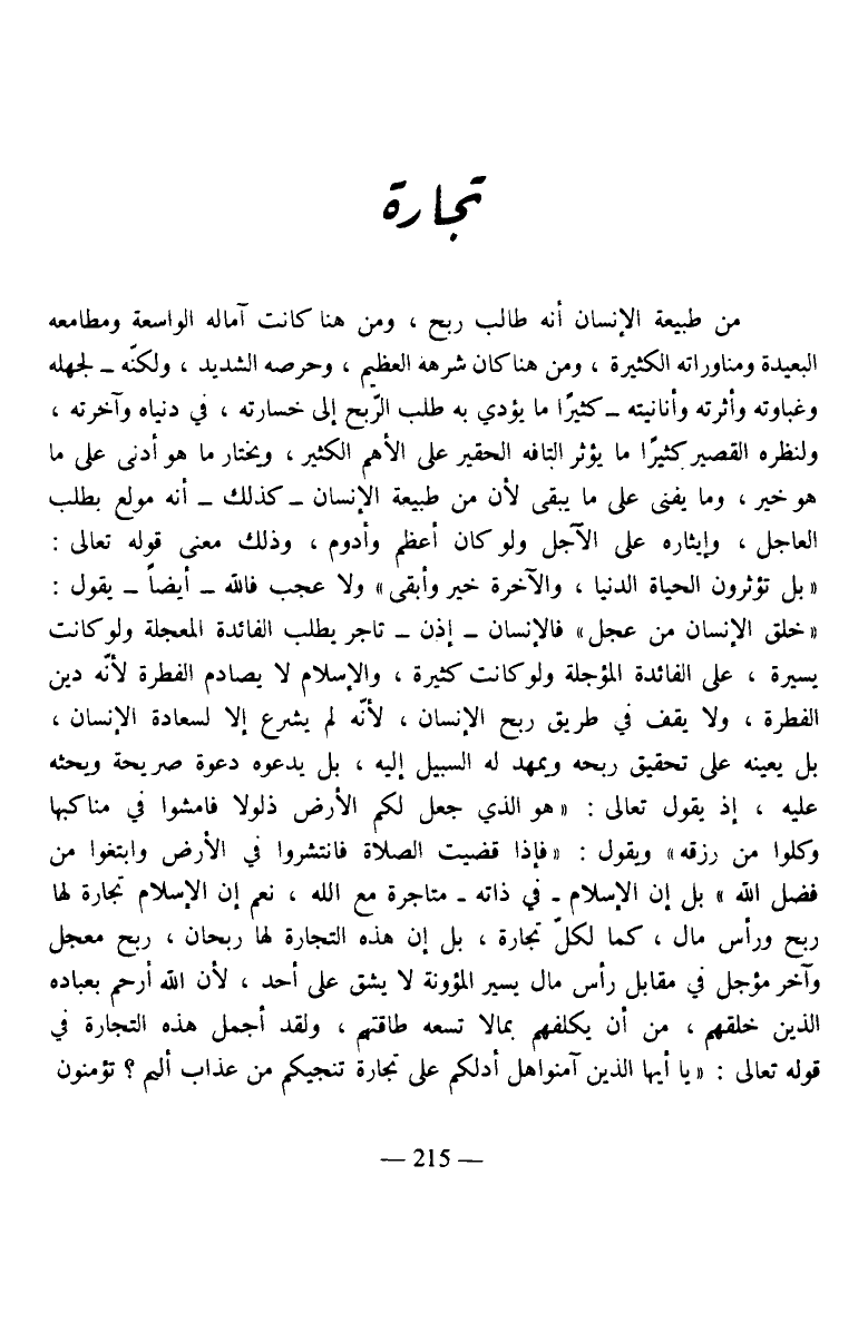من طبيعة الإنسان أنه طالب ربح، ومن هنا كانت آماله الواسعة ومطامعه البعيدة ومناوراته الكثيرة، ومن هنا كان شرهه العظيم، وحرصه الشديد، ولكنه- لجهله وغباوته وأثرته وأنانيته- كثيرا ما يؤدي به طلب الربح إلى خسارته، في دنياه وآخرته، ولنظره القصير كثيرا ما يؤثر التافه الحقير على الأهم الكثير، ويختار ما هو أدنى على ما هو خير، وما يفنى على ما يبقى لأن من طبيعة الإنسان- كذلك- أنه مولع بطلب العاجل، وإيثاره على الآجل ولو كان أعظم وأدوم، وذلك معنى قوله تعالى: {بَلْ تُؤْثِرُونَ الْحَيَاةَ الدُّنْيَا * وَالْآخِرَةُ خَيْرٌ وَأَبْقَى} ولا عجب فالله- أيضا يقول: {خُلِقَ الْإِنْسَانُ مِنْ عَجَلٍ} فالإنسان- إذن- تاجر يطلب الفائدة المعجلة ولو كانت يسيرة، على الفائدة المؤجلة ولو كانت كثيرة، والإسلام لا يصادم الفطرة لأنه دين الفطرة، ولا يقف في طريق ربح الإنسان، لأنه لم يشرع إلا لسعاده الإنسان، بل يعينه على تحقيق ربحه ويمهد له السبيل إليه، بل يدعوه دعوة صريحة ويحثه عليه، إذ يقول تعالى: {هُوَ الَّذِي جَعَلَ لَكُمُ الْأَرْضَ ذَلُولًا فَامْشُوا فِي مَنَاكِبِهَا وَكُلُوا مِنْ رِزْقِهِ} ويقول: {فَإِذَا قُضِيَتِ الصَّلَاةُ فَانْتَشِرُوا فِي الْأَرْضِ وَابْتَغُوا مِنْ فَضْلِ اللَّهِ} بل إن الإسلام- في ذاته- متاجرة مع الله، نعم إن الإسلام تجارة لها ربح ورأس مال، كما لكل تجارة، بل إن هذه التجارة لها ربحان، ربح معجل وآخر مؤجل في مقابل رأس مال يسير المؤونة لا يشق على أحد، لأن الله أرحم بعباده الذين خلقهم، من أن يكلفهم بما لا تسعه طاقتهم، ولقد أجمل هذه التجاره في قوله تعالى: {يَا أَيُّهَا الَّذِينَ آمَنُوا هَلْ أَدُلُّكُمْ عَلَى تِجَارَةٍ تُنْجِيكُمْ مِنْ عَذَابٍ أَلِيمٍ *