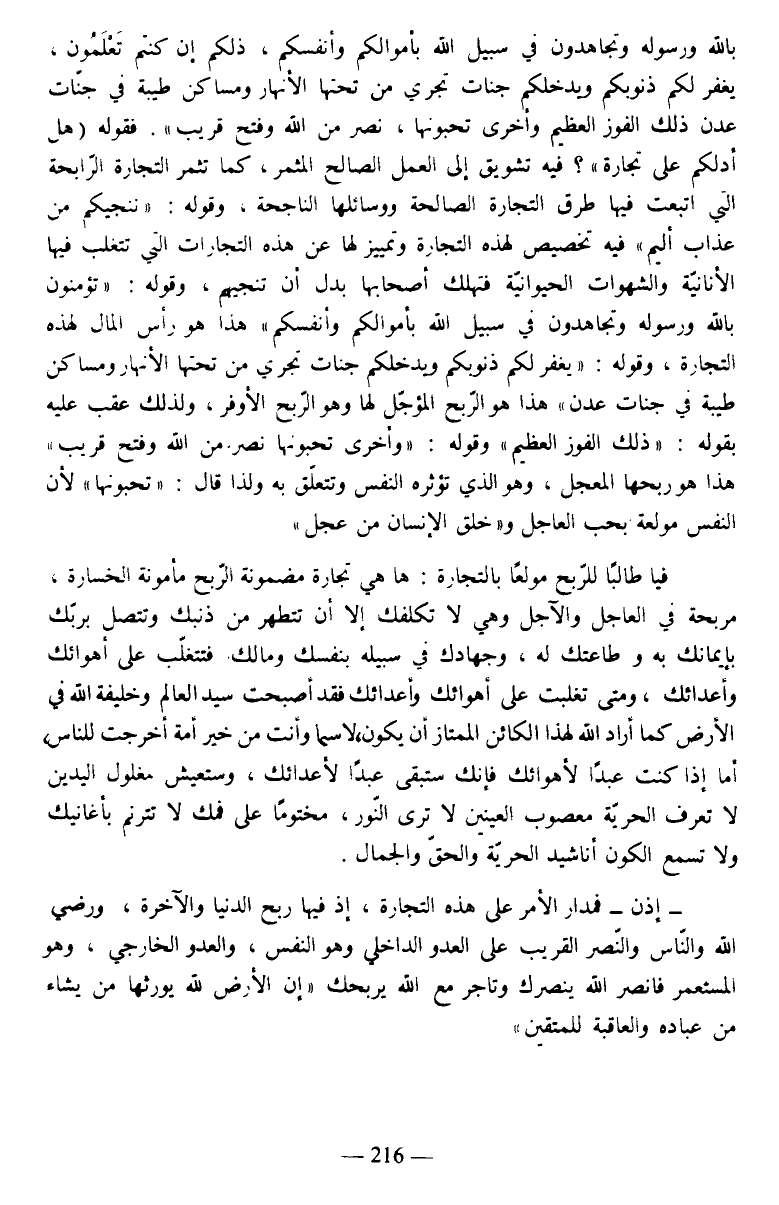 فيا طاليا للربح مولعا بالتجارة: ها هي تجارة مضمونة الربح مأمونة الخسارة، مربحة في العاجل والآجل وهي لا تكلفك إلا أن تتطهر من ذنبك وتتصل بربك بإيمانك به وطاعتك له، وجهادك في سبيله بنفسك ومالك فتتغلب على أهوائك وأعدائك، ومتى تغلبت على أهوائك وأعدائك فقد أصبحت سيد العالم وخليفة الله في الأرض كما أراد الله لهذا الكائن الممتاز أن يكون، لاسما وأنت من خير أمة أخرجت للناس، أما إذا كنت عبدا لأهوائك فإنك ستبقى عبدا لأعدائك، وستعيش مغلول اليدين لا تعرف الحرية معصوب العينين لا ترى النور، مختوما على فمك لا تترنم بأغانيك ولا تسمع الكون أناشيد الحرية والحق والجمال.