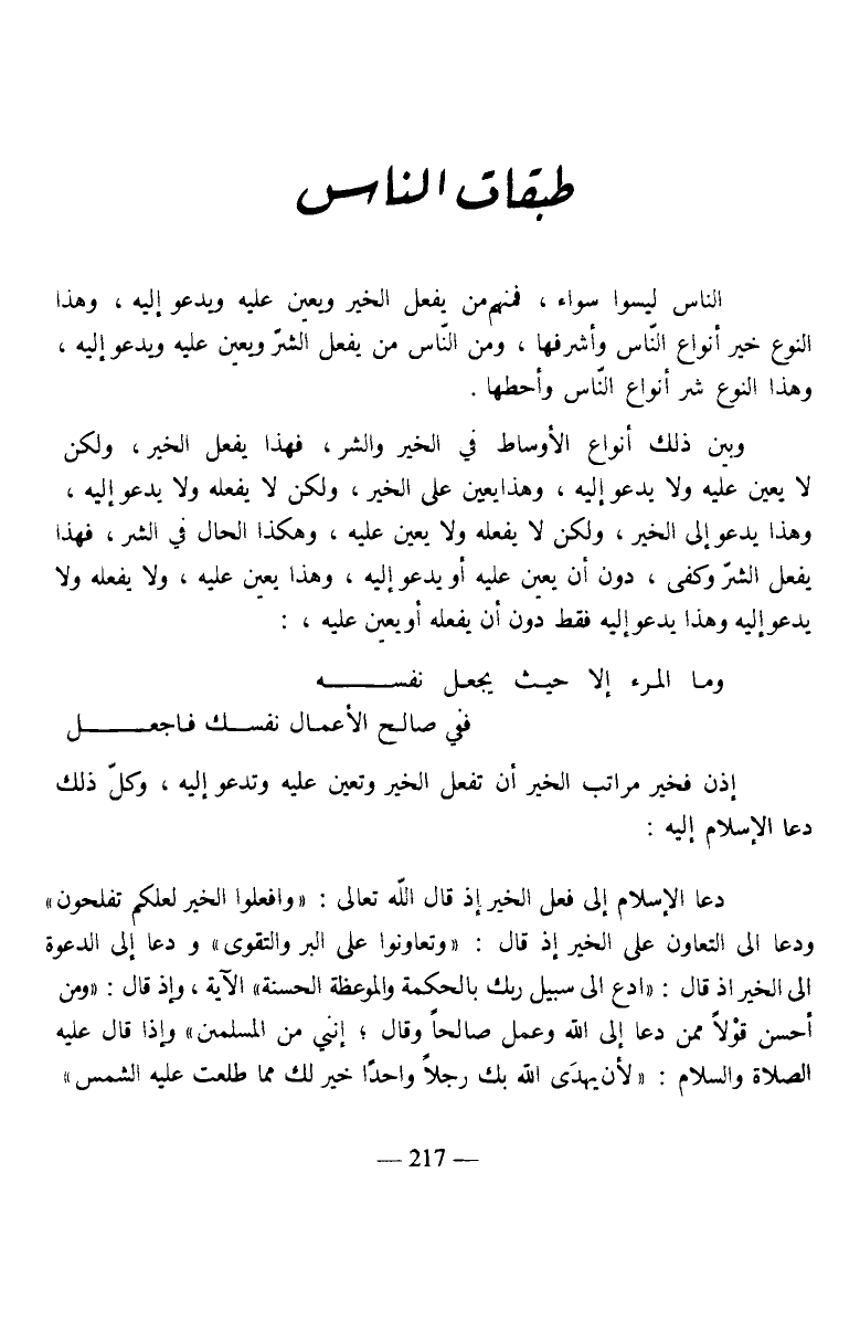 وبين ذلك أنواع الأوساط في الخير والشر، فهذا يفعل الخير، ولكن لا يعين عليه ولا يدعو إليه، وهذا يعين على الخير، ولكن لا يفعله ولا يدعو إليه، وهذا يدعو إلى الخير، ولكن لا يفعله ولا يعين عليه، وهكذا الحال في الشر، فهذا يفعل الشر وكفى، دون أن يعين عليه أو يدعو إليه، وهذا يعين عليه، ولا يفعله ولا يدعو إليه وهذا يدعو إليه فقط دون أن يفعله أو يعين عليه،: