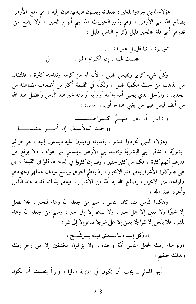 وكل شيء كريم ونفيس قليل، لأن له من كرمه ونفاسته كثرة، فالمثقال من الذهب من حيث الكمية قليل، ولكنه في القيمة أكثر من أضعاف مضاعفة من الحديد، والرجل الذي يحيي أمة بعلمه أو رأيه أو ماله خير عند الناس وأفضل عند الله من ألف ليس فيهم من يغني غناءه أو يسد مسده: