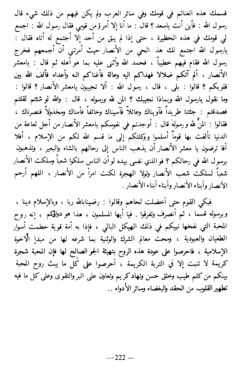 قسمك هذه الغنائم في قومك وفي سائر العرب ولم يكن فيهم من ذلك شيء قال رسول الله: فأين أنت يا سعد؟ قال: ما أنا إلا أمرؤ من قومي فقال رسول الله: اجمع لي قومك في هذه الحظيرة، حتى إذا لم يبق من أحد إلا أجتمع له أتاه فقال: يا رسول الله اجتمع لك هذ الحي من الأنصار حيث أمرتني أن أجمعهم فخرج رسول الله فقام فيهم خطيبا، فحمد الله وأثنى عليه بما هو أهله ثم قال: يا معشر الأنصار، ألم آتكم ضلالا فهداكم إليه وعالة فأغناكم الله وأعداء فألف الله بين قلوبكم؟ قالوا: بلى، قال، رسول الله: ألا تجيبون يا معشر الأنصار؟ قالوا: وما نقول يا رسول الله وبماذا نجيبك؟ المن لله ورسوله، قال: والله لو شئتم لقلتم فصدقتم: جئتنا طريدا فآويناك وعائلا فآسيناك وخائفا فأمناك ومخذولا فنصرناك، فقالوا: المن لله ورسوله قال: أوجدتم في نفوسكم يا معشر الأنصار من أجل لعاعة من الدنيا تألفت بها قوما أسلموا ووكلتكم إلى ما قسم الله لكم من الإسلام، أفلا ترضون يا معشر الأنصار أن يذهب الناس إلى رحالهم بالشاء والبعير، وتذهبون برسول الله في رحالكم؟ فو الذي نفسى بيده لو أن الناس سلكوا شعبا وسلكت الأنصار شعبا لسلكت شعب الأنصار ولولا الهجرة لكنت امرأ من الأنصار، اللهم أرحم الأنصار وأبناء الأنصار وأبناء أبناء الأنصار.