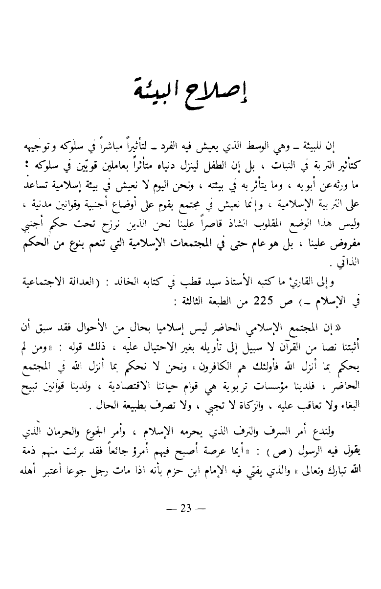 "إن المجتمع الإسلامي الحاضر ليس إسلاميا بحال من الأحوال فقد سبق أن أثبتنا نصا من القرآن لا سبيل إلى تأويله بغير الاحتيال عليه، ذلك قوله: {وَمَنْ لَمْ يَحْكُمْ بِمَا أَنْزَلَ اللَّهُ فَأُولَئِكَ هُمُ الْكَافِرُونَ} ونحن لا نحكم بما أنزل الله في المجتمع الحاضر، فلدينا مؤسسات تربوية هي قوام حياتنا الاقتصادية، ولدينا قوانين تبيح البغاء ولا تعاقب عليه، والزكاة لا تجبى، ولا تصرف بطبيعة الحال.