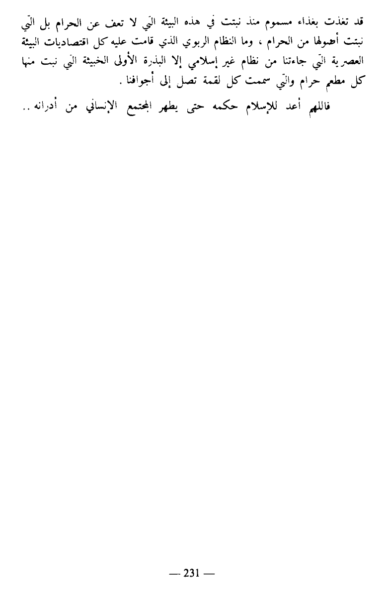 قد تغذت بغذاء مسموم منذ نبتت في هذه البيئه التي لا تعف عن الحرام بل التي نبتت أصولها من الحرام، وما النظام الربوي الذي قامت عليه كل اقتصاديات البيئة العصرية التي جاءتنا من نظام غير إسلامي إلا البذرة الأولى الخبيثة التي نبت منها كل مطعم حرام والتي سممت كل لقمة تصل إلى أجوافنا.
