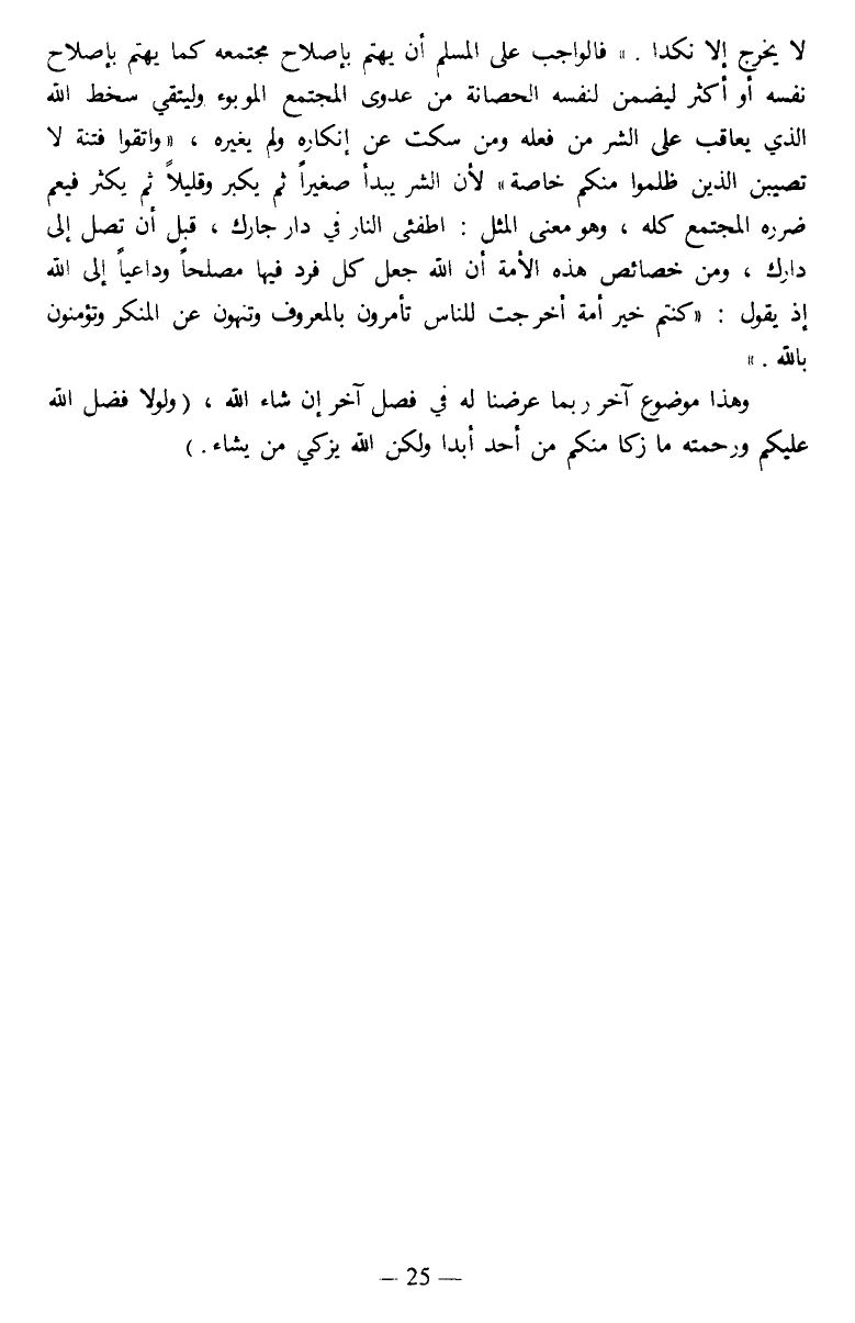 لَا يَخْرُجُ إِلَّا نَكِدًا.} فالواجب على المسلم أن يهتم بإصلاح مجتمعه كما يهتم بإصلاح نفسه أو أكثر ليضمن لنفسه الحصانة من عدوى المجتمع الموبوء وليتقي سخط الله الذي يعاقب على الشر من فعله ومن سكت عن إنكاره ولم يغيره، {وَاتَّقُوا فِتْنَةً لَا تُصِيبَنَّ الَّذِينَ ظَلَمُوا مِنْكُمْ خَاصَّةً} لأن الشر يبدأ صغيرا ثم يكبر وقليلا ثم يكثر فيعم ضرره المجتمع كله، وهو معنى المثل: اطفئى النار في دار جارك، قبل أن تصل إلى دارك، ومن خصائص هذه الأمة أن الله جعل كل فرد فيها مصلحا وداعيا إلى الله إذ يقول: {كُنْتُمْ خَيْرَ أُمَّةٍ أُخْرِجَتْ لِلنَّاسِ تَأْمُرُونَ بِالْمَعْرُوفِ وَتَنْهَوْنَ عَنِ الْمُنْكَرِ وَتُؤْمِنُونَ بِاللَّهِ}.