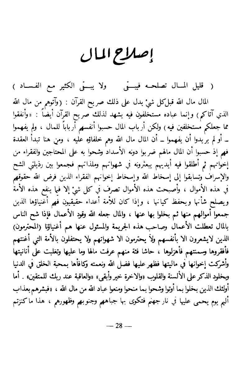 المال مال الله قبل كل شيء يدل على ذلك صريح القرآن: {وَآتُوهُمْ مِنْ مَالِ اللَّهِ الَّذِي آتَاكُمْ} وإنما عباده مستخلفون فيه يشهد لذلك صريح القرآن أيضا: {وَأَنْفِقُوا مِمَّا جَعَلَكُمْ مُسْتَخْلَفِينَ فِيهِ} ولكن أرباب المال حسبوا أنفسهم أربابا للمال، ولم يفهموا - أو لم يريدوا أن يفهموا- أن المال مال الله وهم خلفاؤه عليه، ومن هنا تبدأ العقدة فهم إذ حسبوا أن المال مالهم ضربوا دونه الأسداد وشحوا به على المحتاجين والفقراء من إخوانهم ثم أطلقوا فيه أيديهم يبعثرونه في شهواتهم وملذاتهم فجمعوا بين رذيلتي الشح والإسراف وتسابقوا إلى إسخاط الله وإسخاط إخوانهم الفقراء الذين فرض الله حقوقهم في هذه الأموال، وأصبحت هذه الأموال تصرف في كل شيء إلا فيما ينفع هذه الأمة ويصلح شأنها ويحفظ كيانها، وإذا كان للأمة أعداء حقيقيون فهم أغنياؤها الذين جمعوا أموالهم منها ثم بخلوا بها عنها، والمال جعله الله وقود الأعمال فإذا شح الناس بالمال تعطلت الأعمال وصاحب هذه الجريمة والمسئول عنها هم أغنياؤنا (المحترمون) الذين لا يشعرون إلا بأنفسهم ولا يحترمون إلا شهواتهم ولا يحتفلون بالأمة التي أغنتهم فأفقروها وسمنتهم فأهزلوها، حاشا فئة منهم عرفت ما لها وما عليها وتغلبت على أنانيتها وأشركت إخوانها في ماليتها فظهر عليها فضل الله ونعمته وكافأها بمحبة الخلق في الدنيا وبخلود الذكر على الألسنة، والقلوب {وَالْآخِرَةُ خَيْرٌ وَأَبْقَى} {وَالْآخِرَةُ عِنْدَ رَبِّكَ لِلْمُتَّقِينَ}. أما أولئك الذين بخلوا بما أوتوا وشحوا بما منحوا ومنعوا عباد الله من مال الله، {فَبَشِّرْهُمْ بِعَذَابٍ أَلِيمٍ * يَوْمَ يُحْمَى عَلَيْهَا فِي نَارِ جَهَنَّمَ فَتُكْوَى بِهَا جِبَاهُهُمْ وَجُنُوبُهُمْ وَظُهُورُهُمْ هَذَا مَا كَنَزْتُمْ