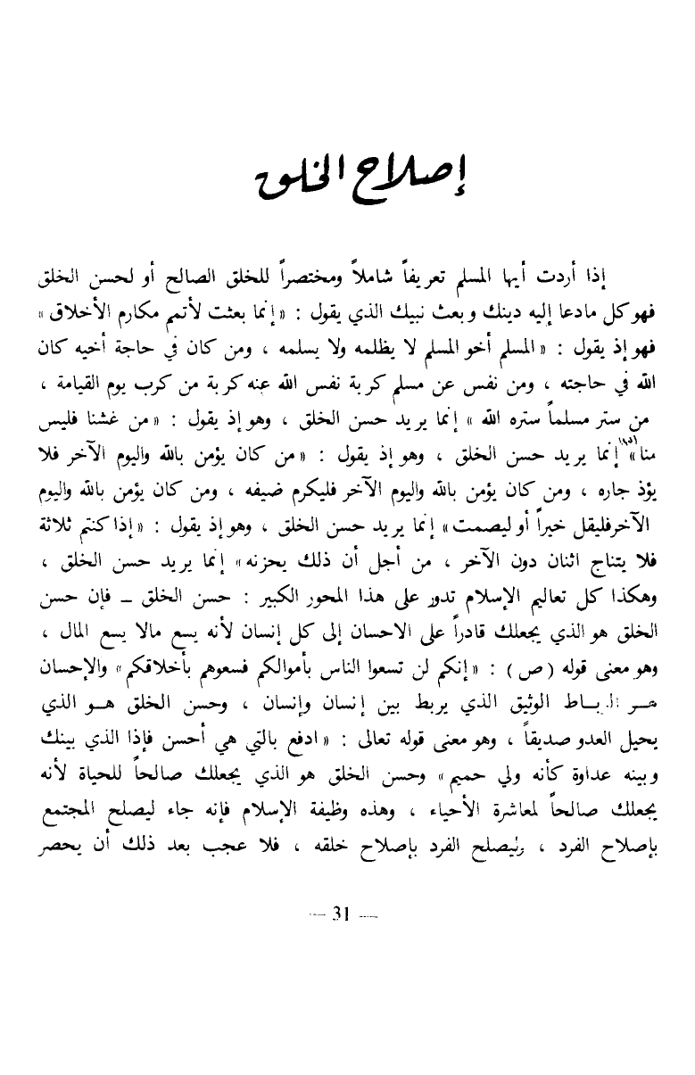 إذا أردت أيها المسلم تعريفا شاملا ومختصرا للخلق الصالح أو لحسن الخلق فهو كل ما دعا إليه دينك وبعث نبيك الذي يقول: "إنما بعثت لأتمم مكارم الأخلاق" فهو إذ يقول: "المسلم أخو المسلم لا يظلمه ولا يسلمه، ومن كان في حاجة أخيه كان الله في حاجته، ومن نفس عن مسلم كربة نفس الله عليه كربة من كرب يوم القيامة، من ستر مسلما ستره الله" إنما يريد حسن الخلق، وهو إذ يقول: "من غشنا فليس منا" إنما يريد حسن الخلق، وهو إذ يقول: "من كان يؤمن بالله واليوم الآخر فلا يؤذ جاره، ومن كان يؤمن بالله واليوم الآخر فليكرم ضيفه، ومن كان يؤمن بالله واليوم الآخر فليقل خيرا أو ليصمت" إنما يريد حسن الخلق، وهو إذ يقول: "إذا كنتم ثلاثة فلا يتناج اثنان دون الآخر، من أجل أن ذلك يحزنه" إنما يريد حسن الخلق، وهكذا كل تعاليم الإسلام تدور على هذا المحور الكبير: حسن الخلق- فإن حسن الخلق هو الذي بحعلك قادرا على الإحسان إلى كل إنسان لأنه يسع ما لا يسع المال، وهو معنى قوله صلى الله عليه وسلم: "إنكم لن تسعوا الناس بأموالكم فسعوهم بأخلاقكم" والإحسان هو الرباط الوثيق الذي يربط بين إنسان وإنسان، وحسن الخلق هو الذي يحيل العدو صديقا، وهو معنى قوله تعالى: {ادْفَعْ بِالَّتِي هِيَ أَحْسَنُ فَإِذَا الَّذِي بَيْنَكَ وَبَيْنَهُ عَدَاوَةٌ كَأَنَّهُ وَلِيٌّ حَمِيمٌ} وحسن الخلق هو الذي يجعلك صالحا للحياة لأنه يجعلك صالحا لمعاشرة الأحياء، وهذه وظيفة الإسلام فإنه جاء ليصلح المجتمع بإصلاح الفرد، وليصلح الفرد بإصلاح خلقه، فلا عجب بعد ذلك أن يحصر
