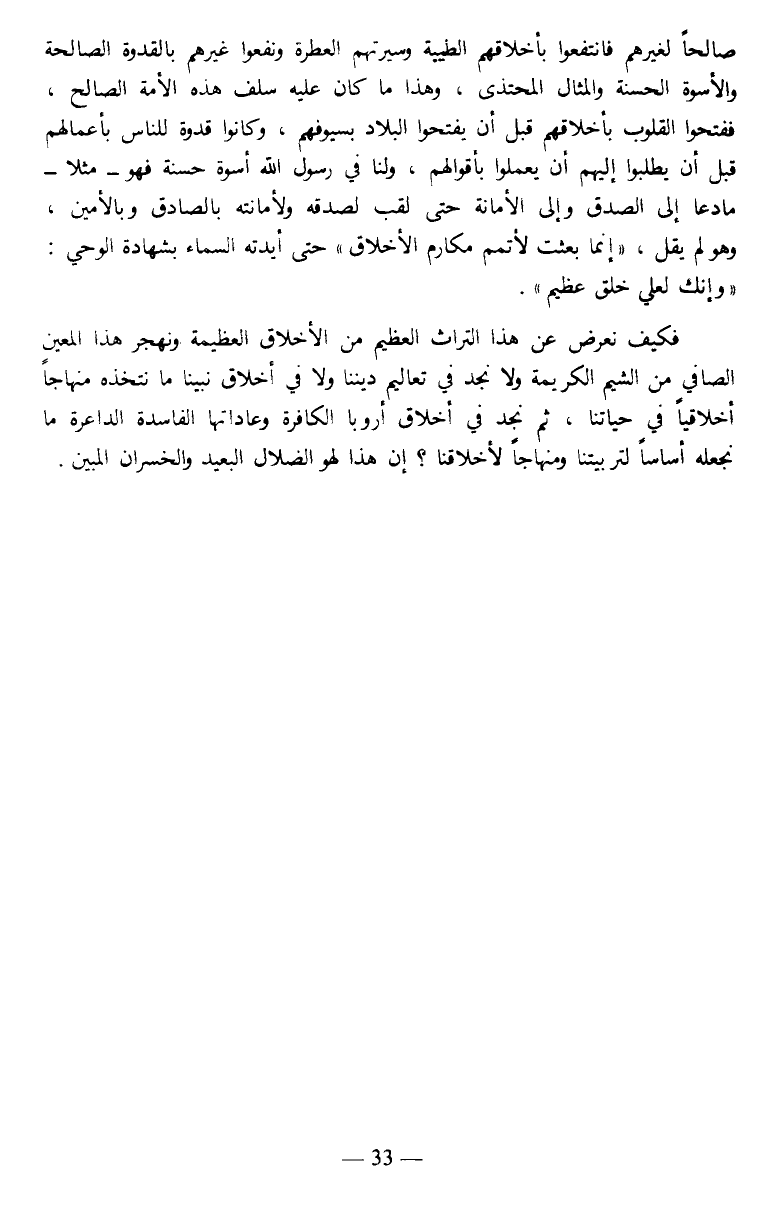 فكيف نعرض عن هذا التراث العظيم من الأخلاق العظيمة. ونهجر هذا المعين الصافي من الشيم الكريمة ولا نجد في تعاليم ديننا ولا في أخلاق نبينا ما نتخذه منهاجا أخلاقيا في حياتنا، ثم نجد في أخلاق أوربا الكافرة وعاداتها الفاسدة الداعرة ما نجعله أساسا لتربيتنا ومنهاجا لأخلاقنا؟ إن هذا لهو الضلال البعيد والخسران المبين.