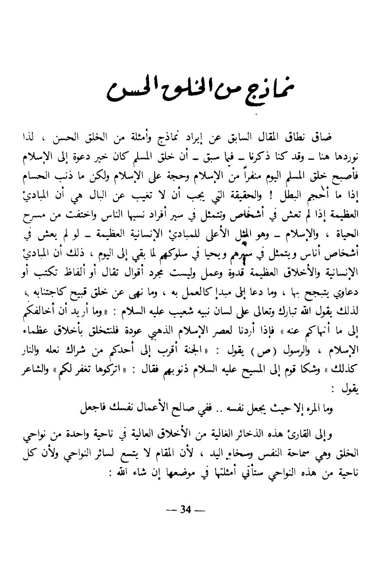 ضاق نطاق المقال السابق عن إيراد نماذج وأمثلة من الخلق الحسن، لذا نوردها هنا- وقد كنا ذكرنا- فيما سبق- أن خلق المسلم كان خير دعوة إلى الإسلام فأصبح خلق المسلم اليوم منفرا من الإسلام وحجه على الإسلام ولكن ما ذنب الحسام إذا ما أحجم البطل والحقيقة التي يجب أن لا تغيب عن البال هي أن المبادئ العظيمة إذا لم تعش في أشخاص وتتمثل في سير أفراد نسيها الناس واختفت من مسرح الحياة، والإسلام -وهو المثل الأعلى للمبادئ الإنسانية العظيمة- لو لم يعش في أشخاص أناس ويتمثل في سيرهم ويحيا في سلوكهم لما بقي إلى اليوم، ذلك أن المبادئ الإنسانية والأخلاق العظيمة قدوة وعمل وليست مجرد أقوال تقال أو الفاظ تكتب أو دعاوي يتبجح بها، وما دعا إلى مبدإ كالعمل به، وما نهى عن خلق قبيح كاجتنابه، لذلك يقول الله تبارك وتعالى على لسان نبيه شعيب عليه السلام: {وَمَا أُرِيدُ أَنْ أُخَالِفَكُمْ إِلَى مَا أَنْهَاكُمْ عَنْهُ} فإذا أردنا لعصر الإسلام الذهبي عودة فلنتخلق بأخلاق عظماء الإسلام، والرسول صلى الله عليه وسلم يقول: " الجنة أقرب إلى أحدكم من شراك نعله والنار كذلك" وشكا قوم إلى المسيح عليه السلام ذنوبهم فقال: "اتركوها تغفر لكم" والشاعر يقول: