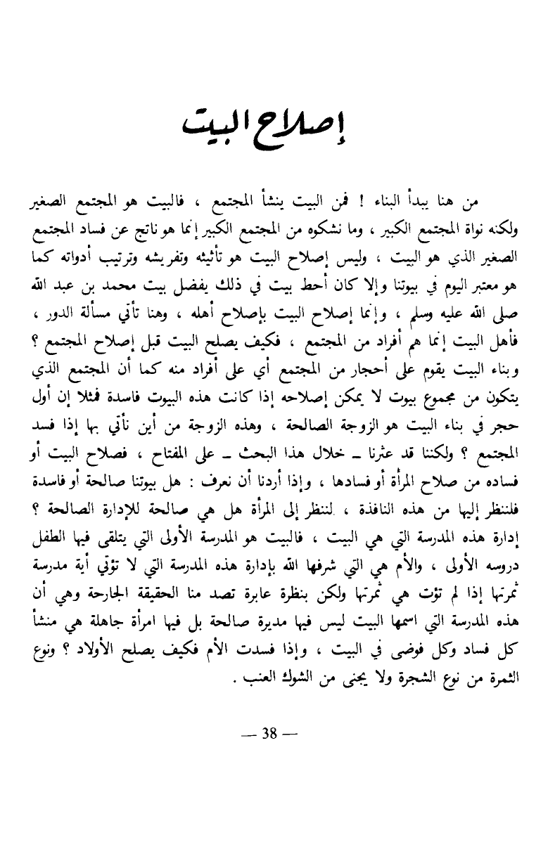 من هنا يبدأ البناء! فمن البيت ينشأ المجتمع، فالبيت هو المجتمع الصغير ولكنه نواة المجتمع الكبير، وما نشكوه من المجتمع الكبير إنما هو ناتج عن فساد المجتمع الصغير الذي هو البيت، وليس إصلاح البيت هو تأثيثه وتفريشه وترتيب أدواته كما هو معتبر اليوم في بيوتنا وإلا كان أحط بيت في ذلك يفضل بيت محمد بن عبد الله صلى الله عليه وسلم، وإنما إصلاح البيت بإصلاح أهله، وهنا تأتي مسألة الدور، فأهل البيت إنما هم أفراد من المجتمع، فكيف يصبح البيت قبل إصلاح المجتمع؟ وبناء البيت يقوم على أحجار من المجتمع أي على افراد منه كما أن المجتمع الذي يتكون من مجموع بيوت لا يمكن إصلاحه إذا كانت هذه البيوت فاسدة فمثلا إن أول حجر في بناء البيت هو الزوجة الصالحة، وهذه الزوجة من أين نأتي بها إذا فسد المجتمع؟ ولكننا قد عثرنا- خلال هذا البحث- على المفتاح، فصلاح البيت أو فساده من صلاح المرأة أو فسادها، وإذا أردنا أن نعرف: هل بيوتنا صالحة أو فاسده فلننظر إليها من هذه النافذة، لننظر إلى المرأة هل هي صالحة للإدارة الصالحة؟ إدارة هذه المدرسة التي هي البيت، فالبيت هو المدرسة الأولى التي يتلقى فيها الطفل دروسه الأولى، والأم هي التي يشرفها الله بإدارة هذه المدرسة التي لا تؤتي أية مدرسة ثمرتها إذا لم تؤت هي ثمرتها ولكن بنظرة عابرة تصد منا الحقيقة الجارحة وهي أن هذه المدرسة التي اسمها البيت ليس فيها مديرة صالحة بل فيها امرأة جاهلة هي منشأ كل فساد وكل فوضى في البيت، وإذا فسدت الأم فكيف يصلح الأولاد؟ ونوع الثمرة من نوع الشجرة ولا يجنى من الشوك العنب.