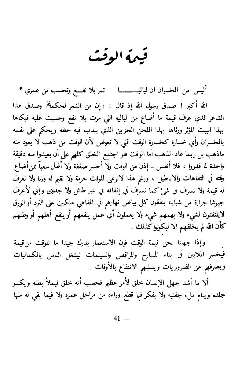 الله أكبر! صدق رسول الله إذ قال: "إن من الشعر لحكمة" وصدق هذا الشاعر الذي عرف قيمة ما أضاع من لياليه التي مرت بلا نفع وحسبت عليه فبكاها بهذا البيت المؤثر ورثاها بهذا اللحن الحزين الذي بندب فيه حظه ويحكم على نفسه بالخسران وأي خسارة كخسارة الوقت التي لا تعوض لأن الوقت من ذهب لا يعود منه ما ذهب بل ربما عاد الذهب أما الوقت فلو اجتمع الخلق كلهم على أن يعيدوا منه دقيقة واحدة لما قدروا، فلا أنفس- إذن من الوقت ولا أخسر صفقة ولا أضل سعيا ممن أضاع وقته في التفاهات والأباطيل، ورغم هذا لا نرعى للوقت حرمة ولا نقم له وزنا ولا نعرف له قيمة ولا نسرف في شيء كما نسرف في إنفاقه في غير طائل ولا جدوى وإني لأعرف جيوشنا جرارة من شبابنا ينفقون كل بياض نهارهم في المقاهي منكبين على النرد أو الورق لا يلتفتون لشيء ولا يهمهم شيء ولا يعملون أي عمل ينفعهم أو ينفع أهلهم أو وطنهم كأن الله لم يخلقهم إلا ليكونوا كذلك.