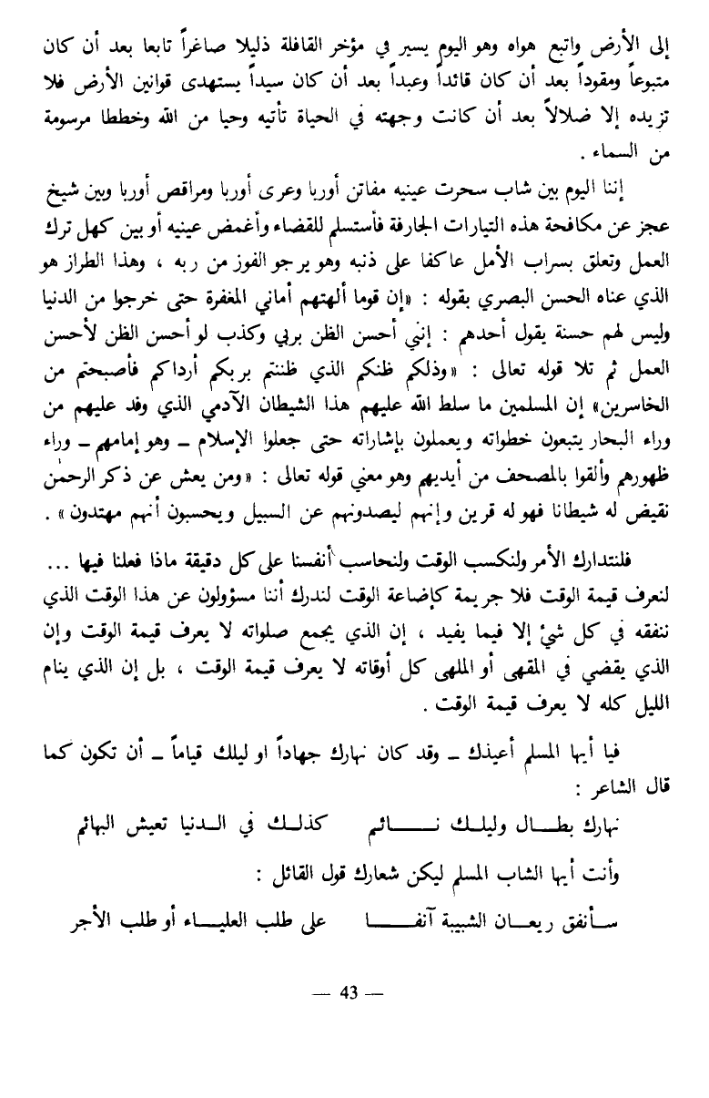 إننا اليوم بين شاب سحرت عينيه مفاتن أوربا وعرى أوربا ومراقص أوربا وبين شيخ عجز عن مكافحة هذه التيارات الجارفة فأستسلم للقضاء وأغمض عينيه أو بين كهل ترك العمل وتعلق بسراب الأمل عاكفا على ذنبه وهو يرجو الفوز من ربه، وهذا الطراز هو الذي عناه الحسن البصري بقوله: "إن قوما ألهتهم أماني المغفرة حتى خرجوا من الدنيا وليس لهم حسنة يقول أحدهم: إني أحسن الظن بربي وكذب لو أحسن الظن لأحسن العمل ثم تلا قوله تعالى: {وَذَلِكُمْ ظَنُّكُمُ الَّذِي ظَنَنْتُمْ بِرَبِّكُمْ أَرْدَاكُمْ فَأَصْبَحْتُمْ مِنَ الْخَاسِرِينَ} إن المسلمين ما سلط الله عليهم هذا الشيطان الآدمي الذي وفد عليهم من وراء البحار يتبعون خطواته ويعملون بإشاراته حتى جعلا الإسلام- وهو إمامهم- وراء ظهورهم وألقوا بالمصحف من أيديهم وهو معني قوله تعالى: {وَمَنْ يَعْشُ عَنْ ذِكْرِ الرَّحْمَنِ نُقَيِّضْ لَهُ شَيْطَانًا فَهُوَ لَهُ قَرِينٌ * وَإِنَّهُمْ لَيَصُدُّونَهُمْ عَنِ السَّبِيلِ وَيَحْسَبُونَ أَنَّهُمْ مُهْتَدُونَ}.