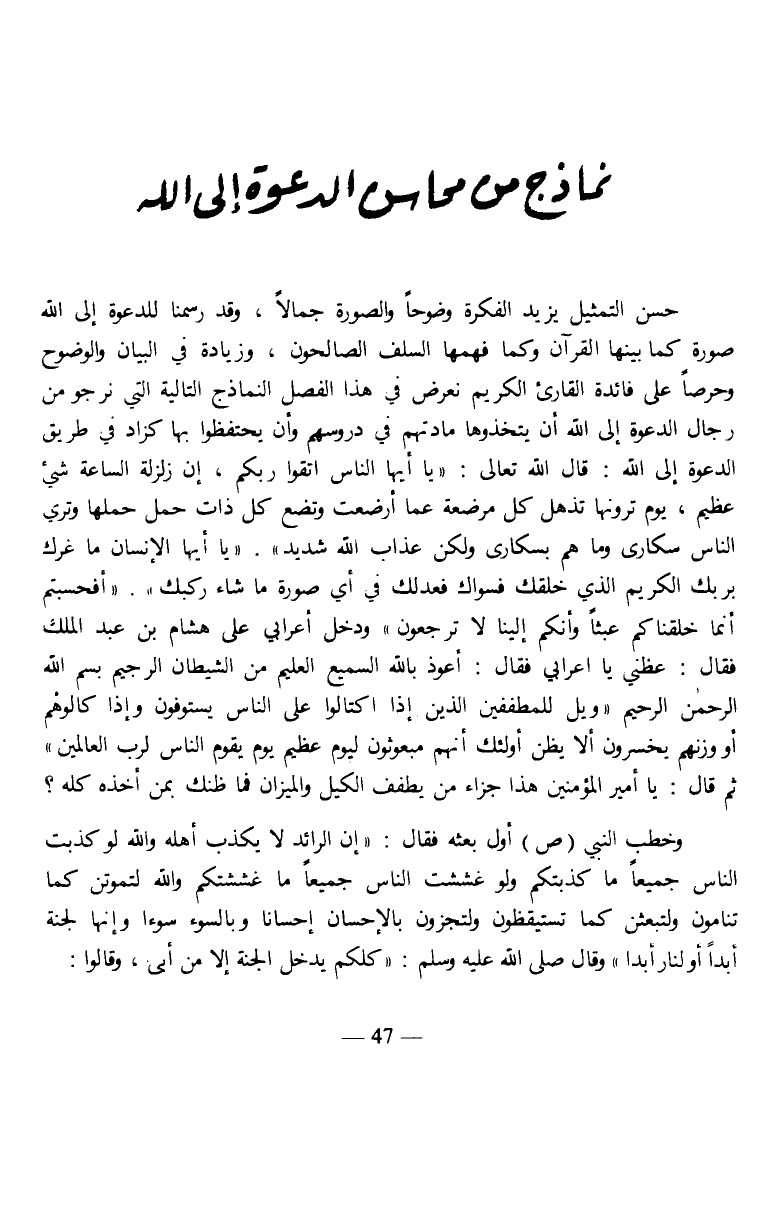حسن التمثيل يزيد الفكرة وضوحا والصورة جمالا، وقد رسمنا للدعوة إلى الله صورة كما بينها القرآن وكما فهمها السلف الصالحون، وزيادة في البيان والوضوح وحرصا على فائدة القارئ الكريم نعرض في هذا الفصل النماذج التالية التي نرجو من رجال الدعوة إلى الله أن يتخذوها مادتهم في دروسهم وأن يحتفظوا بها كزاد في طريق الدعوة إلى الله: قال الله تعالى: {يَا أَيُّهَا النَّاسُ اتَّقُوا رَبَّكُمْ إِنَّ زَلْزَلَةَ السَّاعَةِ شَيْءٌ عَظِيمٌ * يَوْمَ تَرَوْنَهَا تَذْهَلُ كُلُّ مُرْضِعَةٍ عَمَّا أَرْضَعَتْ وَتَضَعُ كُلُّ ذَاتِ حَمْلٍ حَمْلَهَا وَتَرَى النَّاسَ سُكَارَى وَمَا هُمْ بِسُكَارَى وَلَكِنَّ عَذَابَ اللَّهِ شَدِيدٌ}. {يَا أَيُّهَا الْإِنْسَانُ مَا غَرَّكَ بِرَبِّكَ الْكَرِيمِ الَّذِي خَلَقَكَ فَسَوَّاكَ فَعَدَلَكَ فِي أَيِّ صُورَةٍ مَا شَاءَ رَكَّبَكَ}. {أَفَحَسِبْتُمْ أَنَّمَا خَلَقْنَاكُمْ عَبَثًا وَأَنَّكُمْ إِلَيْنَا لَا تُرْجَعُونَ} ودخل أعرابي على هشام بن عبد الله فقال: عظني يا أعرابي فقال: أعوذ بالله السميع العليم من الشيطان الرجيم بسم الله الرحمن الرحيم {وَيْلٌ لِلْمُطَفِّفِينَ * الَّذِينَ إِذَا اكْتَالُوا عَلَى النَّاسِ يَسْتَوْفُونَ * وَإِذَا كَالُوهُمْ أَوْ وَزَنُوهُمْ يُخْسِرُونَ * أَلَا يَظُنُّ أُولَئِكَ أَنَّهُمْ مَبْعُوثُونَ * لِيَوْمٍ عَظِيمٍ * يَوْمَ يَقُومُ النَّاسُ لِرَبِّ الْعَالَمِينَ} ثم قال: يا أمير المؤمنين هذا جزاء من يطفف الكيل والميزان فما ظنك بمن أخذه كله؟