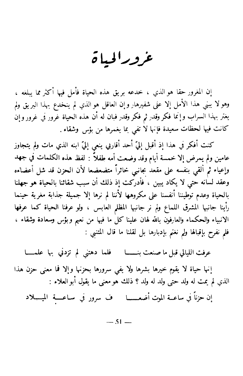 إن المغرور حقا هو الذي، خدعه بريق هذه الحياة فأمل فيها أكثر مما يبلغه، وهو لا يبني هذا الأمل إلا على شفير هار وإن العاقل هو الذي لم ينخدع بهذا البريق ولم يغتر بهذا السراب وإنما فكر وقدر ثم فكر وقدر فبان له أن هذه الحياة غرور في غرور وإن كانت فيها لحظات سعيده فإنها لا تفي بما يغمرها من بؤس وشقاء.