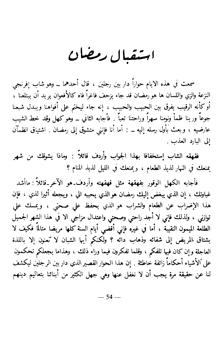 سمعت في هذه الأيام حوارا دار بين رجلين، قال أحدهما- وهو شاب إفرنجي النزعة والزي واللسان ها هو رمضان قد جاء يزحف فاغرا فاه كالأفعوان يريد أن يبتلعنا، أو كأنه الرقيب يفرق بين الحبيب والحبيب، إنه جاء ليختم على أفواهنا ويبدل شبعنا جوعا ورينا ظمأ ونومنا سهرا وراحتنا تعبا. فأجابه الثاني- وهو كهل وقد خط الشيب عارضيه، وبعث بأول رسله إليه-: أما أنا فإنني متشوق إلى رمضان، اشتياق الظمآن إلى البارد العذب.