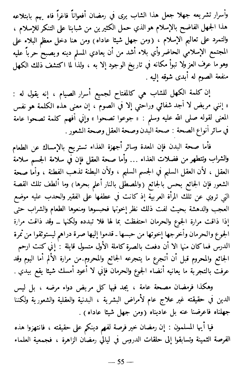 إن كلمة الكهل للشاب هي كالمفتاح لجميع أسرار الصيام، إنه يقول له: "إنني مريض لا أجد شفائي وراحتي إلا في الصوم"، إن معنى هذه الكلمة هو نفس المعنى لقوله صلى الله عليه وسلم: "جوعوا تصحوا" وإني أفهم كلمة تصحوا عامة في سائر أنواع الصحة: صحة البدن وصحة العقل وصحة الشعور.