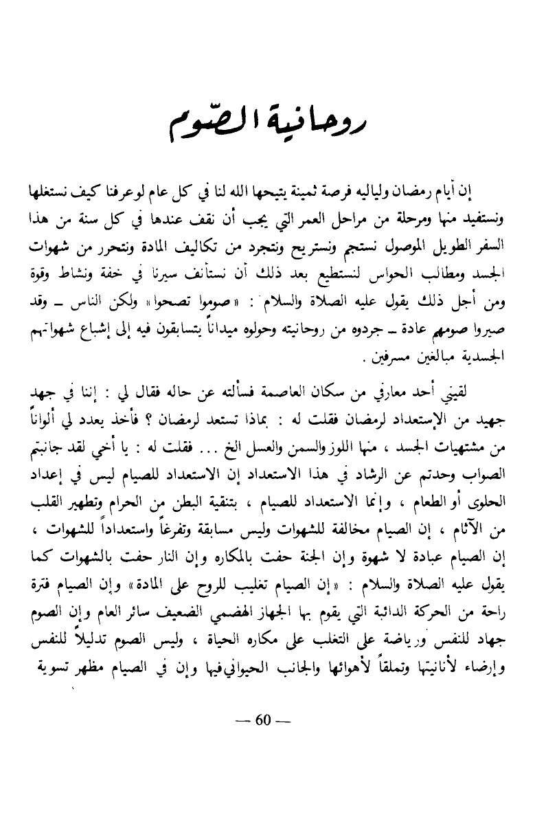لقيني أحد معارفي من سكان العاصمة فسألته عن حاله فقال لي: إننا في جهد جهيد من الإستعداد لرمضان فقلت له: بماذا تستعد لرمضان؟ فأخذ يعدد لي ألوانا من مشتهيات الجسد، منها اللوز والسمن والعسل الخ ... فقلت له: يا أخي لقد جانبتم الصواب وحدتم عن الرشاد في هذا الاستعداد إن الاستعداد للصيام ليس في إعداد الحلوى أو الطعام، وإنما الاستعداد للصيام، بتنقية البطن من الحرام وتطهير القلب من الآثام، إن الصيام مخالفة للشهوات وليس مسابقة وتفرغا واستعدادا للشهوات، إن الصيام عبادة لا شهوة وإن الجنة حفت بالمكاره وإن النار حفت بالشهوات كما يقول عليه الصلاة، السلام: "إن الصيام تغليب للروح على المادة" وإن الصيام فترة راحة من الحركة الدائبة التي يقوم بها الجهاز الهضمي الضعيف سائر العام وإن الصوم جهاد للنفس ورياضة على التغلب على مكاره الحياة، وليس الصوم تدليلا للنفس وإرضاء لأنانيتها وتملقا لأهوائها والجانب الحيواني فيها وإن في الصيام مظهر تسوية