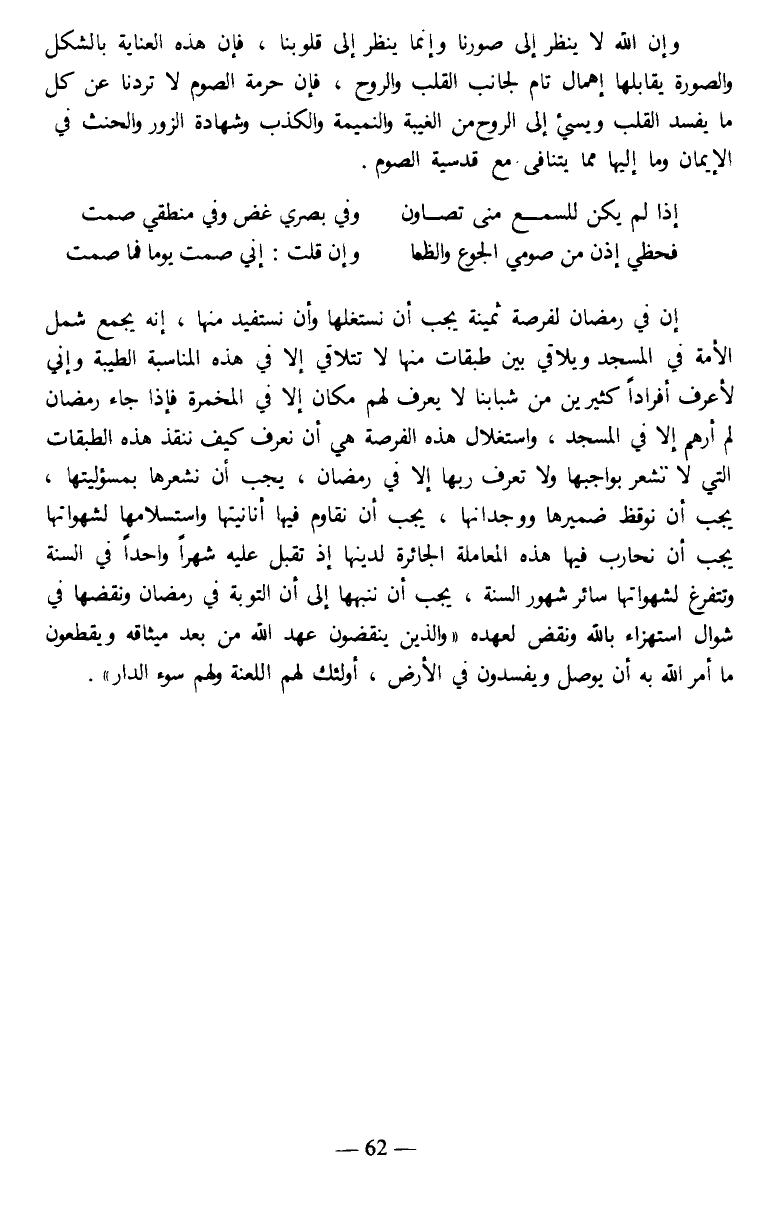 إن في رمضان لفرصة ثمينة يجب أن نستغلها وأن نستفيد منها، إنه يجمع شمل الأمة في المسجد ويلاقي بين طبقات منها لا تتلاقي إلا في هذه المناسبة الطيبة وإني لأعرف أفرادا كثيرين من شبابنا لا يعرف لهم مكان إلا في المخمرة فإذا جاء رمضان لم أرهم إلا في المسجد، واستغلال هذه الفرصة هي أن نعرف كيف ننقذ هذه الطبقات التي لا تشعر بواجبها ولا تعرف ربها إلا في رمضان، يجب أن نشعرها بمسؤليتها، يجب أن نوقظ ضميرها ووجدانها، يجب أن نقاوم فيها أنانيتها واستسلامها لشهواتها يجب أن نحارب فيها هذه المعاملة الجائرة لدينها إذ تقبل عليه شهرا واحدا في السنة وتتفرغ لشهواتها سائر شهور السنة، يجب أن ننبهها إلى أن التوبة في رمضان ونقضها في شوال استهزاء بالله ونقض لعهده {وَالَّذِينَ يَنْقُضُونَ عَهْدَ اللَّهِ مِنْ بَعْدِ مِيثَاقِهِ وَيَقْطَعُونَ مَا أَمَرَ اللَّهُ بِهِ أَنْ يُوصَلَ وَيُفْسِدُونَ فِي الْأَرْضِ أُولَئِكَ لَهُمُ اللَّعْنَةُ وَلَهُمْ سُوءُ الدَّارِ}.