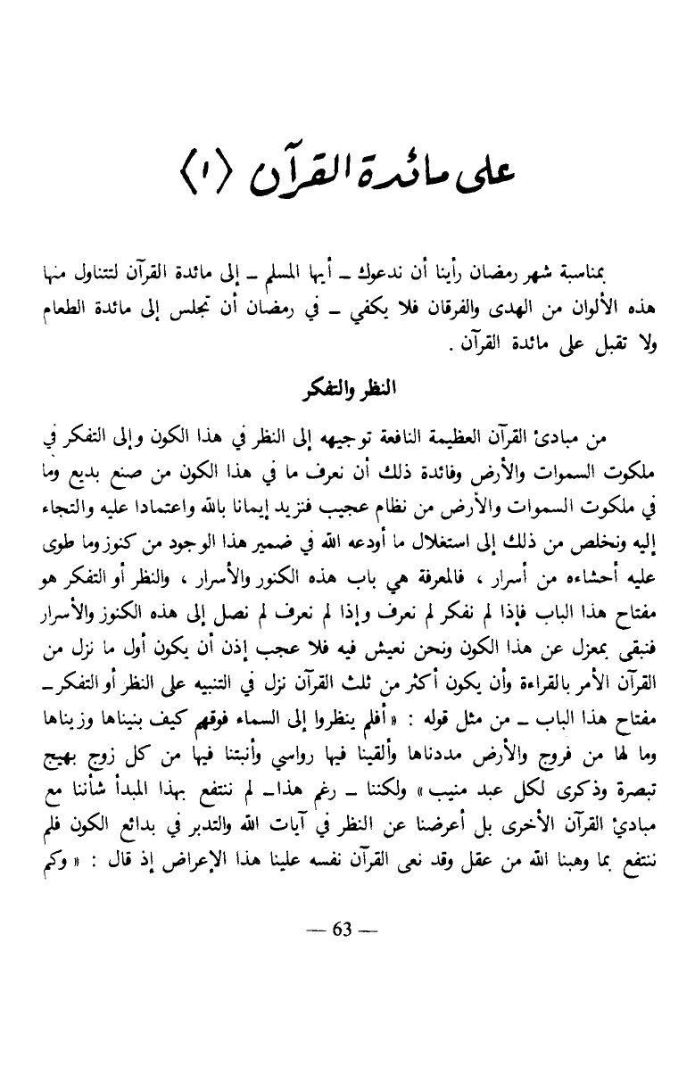 بمناسبة شهر رمضان رأينا أن ندعوك- أيها المسلم- إلى مائدة القرآن لتتناول منها هذه الألوان من الهدى والفرقان فلا يكفي- في رمضان أن تجلس إلى مائدة الطعام ولا تقبل على مائدة القرآن.