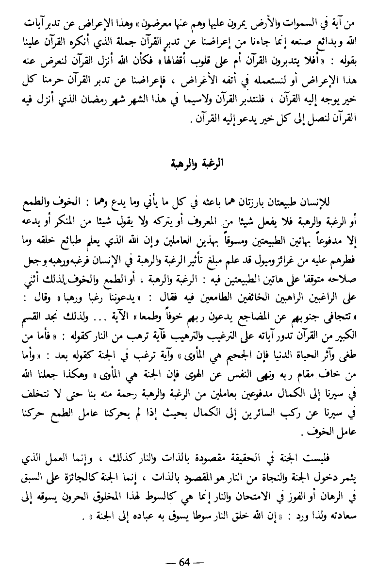 للإنسان طبيعتان بارزتان هما باعثه في كل مما يأني يما ياع وهما: الخوف والطمع أو الرغبة والرهبة فلا يفعل شيئا من المعروف أو يتركه ولا يقول شيئا من المنكر أو يدعه إلا مدفوعا بهاتين الطبيعتين ومسوقا بهذين العاملين وإن الله الذي يعلم طبائع خلقه وما فطرهم عليه من غرائز وميول قد علم مبلغ تأثير الرغبة والرهبة في الإنسان فرغبه ورهبه وجعل صلاحه متوقفا على هاتين الطبيعتين فيه: الرغبة والرهبة، أو الطمع والخوف لذلك أثني على الراغبين الراهبين الخائفين الطامعين فيه فقال: {يَدْعُونَنَا رَغَبًا وَرَهَبًا} وقال: {تَتَجَافَى جُنُوبُهُمْ عَنِ الْمَضَاجِعِ يَدْعُونَ رَبَّهُمْ خَوْفًا وَطَمَعًا} الآية ... ولذلك نجد القسم الكبير من القرآن تدور آياته على الترغيب والترهيب فآية ترهب من النار كقوله: {فَأَمَّا مَنْ طَغَى * وَآثَرَ الْحَيَاةَ الدُّنْيَا * فَإِنَّ الْجَحِيمَ هِيَ الْمَأْوَى} وآية ترغب في الجنة كقوله بعد: {وَأَمَّا مَنْ خَافَ مَقَامَ رَبِّهِ وَنَهَى النَّفْسَ عَنِ الْهَوَى * فَإِنَّ الْجَنَّةَ هِيَ الْمَأْوَى} وهكذا جعلنا الله في سيرنا إلى الكمال مدفوعين بعاملين من الرغبة والرهبة رحمة منه بنا حتى لا نتخلف في سيرنا عن ركب السائرين إلى الكمال بحيث إذا لم يحركنا عامل الطمع حركنا عامل الخوف.