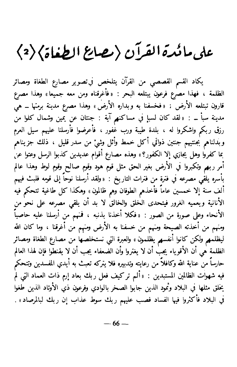 يكاد القسم القصصي من القرآن يتلخص في تصوير مصارع الطغاة ومصائر الظلمة، فهذا مصرع فرعون يبتلعه البحر: {فَأَغْرَقْنَاهُ وَمَنْ مَعَهُ جَمِيعًا} وهذا مصرع قارون تبتلعه الأرض: {فَخَسَفْنَا بِهِ وَبِدَارِهِ الْأَرْضَ} وهذا مصرع مدينة برمتها- هي مدينة سبأ-: {لَقَدْ كَانَ لِسَبَإٍ فِي مَسْكَنِهِمْ آيَةٌ جَنَّتَانِ عَنْ يَمِينٍ وَشِمَالٍ كُلُوا مِنْ رِزْقِ رَبِّكُمْ وَاشْكُرُوا لَهُ بَلْدَةٌ طَيِّبَةٌ وَرَبٌّ غَفُورٌ * فَأَعْرَضُوا فَأَرْسَلْنَا عَلَيْهِمْ سَيْلَ الْعَرِمِ وَبَدَّلْنَاهُمْ بِجَنَّتَيْهِمْ جَنَّتَيْنِ ذَوَاتَيْ أُكُلٍ خَمْطٍ وَأَثْلٍ وَشَيْءٍ مِنْ سِدْرٍ قَلِيلٍ * ذَلِكَ جَزَيْنَاهُمْ بِمَا كَفَرُوا وَهَلْ نُجَازِي إِلَّا الْكَفُورَ} وهذه مصارع أقوام عديدين كذبوا الرسل وعتوا عن أمر ربهم وتكبروا في الأرض بغير الحق مثل قوم هود وقوم صالح وقوم لوط وهذا عالم بأسره يلقي مصرعه في فترة من فترات التاريخ: {وَلَقَدْ أَرْسَلْنَا نُوحًا إِلَى قَوْمِهِ فَلَبِثَ فِيهِمْ أَلْفَ سَنَةٍ إِلَّا خَمْسِينَ عَامًا فَأَخَذَهُمُ الطُّوفَانُ وَهُمْ ظَالِمُونَ} وهكذا كل طاغية تتحكم فيه الأنانية ويعميه الغرور فيتحدى الخلق والخالق لا بد أن يلقي مصرعه على نحو من الأنحاء وعلى صورة من الصور: {فَكُلًّا أَخَذْنَا بِذَنْبِهِ فَمِنْهُمْ مَنْ أَرْسَلْنَا عَلَيْهِ حَاصِبًا وَمِنْهُمْ مَنْ أَخَذَتْهُ الصَّيْحَةُ وَمِنْهُمْ مَنْ خَسَفْنَا بِهِ الْأَرْضَ وَمِنْهُمْ مَنْ أَغْرَقْنَا وَمَا كَانَ اللَّهُ لِيَظْلِمَهُمْ وَلَكِنْ كَانُوا أَنْفُسَهُمْ يَظْلِمُونَ}،والعبرة التي نستخلصها من مصارع الطغاة ومصائر الظلمة هي أن الأقوياء يجب أن لا يغتروا وأن الضعفاء يجب أن لا يقنطوا فإن لهذا العالم حارسا من عناية الله وكافلا من رعايته وتدبيره فلا يتركه تعبث به أيدي المفسدين وتتحكم فيه شهوات الظالمين المستبدين: {أَلَمْ تَرَ كَيْفَ فَعَلَ رَبُّكَ بِعَادٍ * إِرَمَ ذَاتِ الْعِمَادِ * الَّتِي لَمْ يُخْلَقْ مِثْلُهَا فِي الْبِلَادِ * وَثَمُودَ الَّذِينَ جَابُوا الصَّخْرَ بِالْوَادِ * وَفِرْعَوْنَ ذِي الْأَوْتَادِ * الَّذِينَ طَغَوْا فِي الْبِلَادِ * فَأَكْثَرُوا فِيهَا الْفَسَادَ * فَصَبَّ عَلَيْهِمْ رَبُّكَ سَوْطَ عَذَابٍ * إِنَّ رَبَّكَ لَبِالْمِرْصَادِ}.