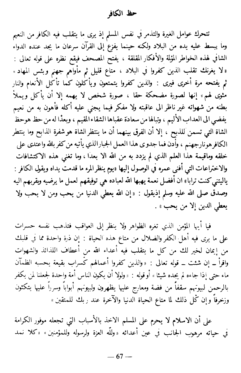 فيا أيها المؤمن الذي تغره الظواهر ولا ينظر إلى العواقب فتذهب نفسه حسرات على ما يرى فيه أهل الكفر والضلال من متاع هذه الحياة: إن ذرة واحدة مما في قلبك من إيمان لخير لك من كل مما يتقلب فيه أعداء الله من أعطاف اللذائذ والشهوات واقرأ- إن شئت- قوله تعالى: {وَالَّذِينَ كَفَرُوا أَعْمَالُهُمْ كَسَرَابٍ بِقِيعَةٍ يَحْسَبُهُ الظَّمْآنُ مَاءً حَتَّى إِذَا جَاءَهُ لَمْ يَجِدْهُ شَيْئًا} أو قوله: {وَلَوْلَا أَنْ يَكُونَ النَّاسُ أُمَّةً وَاحِدَةً لَجَعَلْنَا لِمَنْ يَكْفُرُ بِالرَّحْمَنِ لِبُيُوتِهِمْ سُقُفًا مِنْ فِضَّةٍ وَمَعَارِجَ عَلَيْهَا يَظْهَرُونَ وَلِبُيُوتِهِمْ أَبْوَابًا وَسُرُرًا عَلَيْهَا يَتَّكِئُونَ (34) وَزُخْرُفًا وَإِنْ كُلُّ ذَلِكَ لَمَّا مَتَاعُ الْحَيَاةِ الدُّنْيَا وَالْآخِرَةُ عِنْدَ رَبِّكَ لِلْمُتَّقِينَ}.