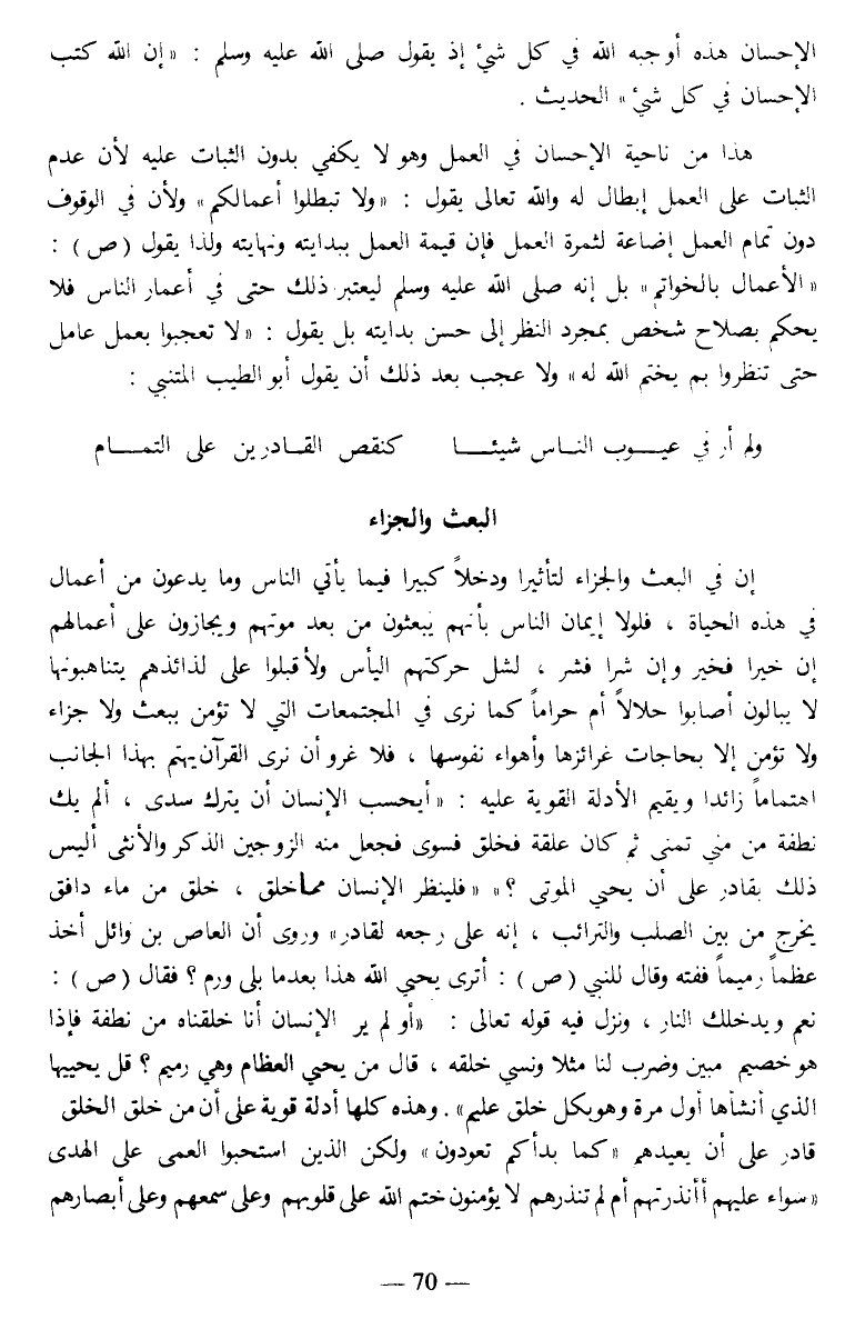 إن في البعث والجزاء لتأثيرا ودخلا كبيرا فيما يأتي الناس وما يدعون من أعمال في هذه الحياة، فلولا إيمان الناس بأنهم يبعثون من بعد موتهم ويجازون على أعمالهم إن خيرا فخير وإن شرا فشر، لشل حركتهم اليأس ولأقبلوا على لذائذهم يتناهبونها لا يبالون أصابوا حلالا أم حراما كما نرى في المجتمعات التي لا تؤمن ببعث ولا جزاء ولا تؤمن إلا بحاجات غرائزها وأهواء نفوسها، فلا غرو أن نرى القرآن- يهتم بهذا الجانب اهتماما زائدا ويقيم الأدلة القوية عليه: {أَيَحْسَبُ الْإِنْسَانُ أَنْ يُتْرَكَ سُدًى * أَلَمْ يَكُ نُطْفَةً مِنْ مَنِيٍّ يُمْنَى * ثُمَّ كَانَ عَلَقَةً فَخَلَقَ فَسَوَّى * فَجَعَلَ مِنْهُ الزَّوْجَيْنِ الذَّكَرَ وَالْأُنْثَى * أَلَيْسَ ذَلِكَ بِقَادِرٍ عَلَى أَنْ يُحْيِيَ الْمَوْتَى} {فَلْيَنْظُرِ الْإِنْسَانُ مِمَّ خُلِقَ * خُلِقَ مِنْ مَاءٍ دَافِقٍ * يَخْرُجُ مِنْ بَيْنِ الصُّلْبِ وَالتَّرَائِبِ * إِنَّهُ عَلَى رَجْعِهِ لَقَادِرٌ} وروي أن العاص بن وائل أخذ عظما رميما ففته وقال للنبي صلى الله عليه وسلم: أترى يحي الله هذا بعدما بلى ورم؟ فقال صلى الله عليه وسلم: نعم ويدخلك النار، ونزل فيه قوله تعالى: {أَوَلَمْ يَرَ الْإِنْسَانُ أَنَّا خَلَقْنَاهُ مِنْ نُطْفَةٍ فَإِذَا هُوَ خَصِيمٌ مُبِينٌ * وَضَرَبَ لَنَا مَثَلًا وَنَسِيَ خَلْقَهُ قَالَ مَنْ يُحْيِ الْعِظَامَ وَهِيَ رَمِيمٌ * قُلْ يُحْيِيهَا الَّذِي أَنْشَأَهَا أَوَّلَ مَرَّةٍ وَهُوَ بِكُلِّ خَلْقٍ عَلِيمٌ}. وهذه كلها أدلة قوية على أن من خلق الخلق قادر على أن يعيدهم {كَمَا بَدَأَكُمْ تَعُودُونَ} ولكن الذين استحبوا العمى على الهدى {سَوَاءٌ عَلَيْهِمْ أَأَنْذَرْتَهُمْ أَمْ لَمْ تُنْذِرْهُمْ لَا يُؤْمِنُونَ (6) خَتَمَ اللَّهُ عَلَى قُلُوبِهِمْ وَعَلَى سَمْعِهِمْ وَعَلَى أَبْصَارِهِمْ