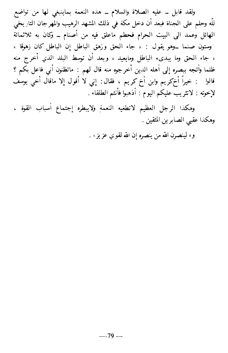 ولقد قابل- عليه الصلاة والسلام- هذه النعمة بما ينبغي لها من تواضع لله وحلم على الجناة فبعد أن دخل مكة في ذلك المشهد المهيب والمهرجان التاريخي الهائل وعمد إلى البيت الحرام فحطم ما علق فيه من أصنام- وكان به ثلاثمائة وستون صنما- وهو يقول: {جَاءَ الْحَقُّ وَزَهَقَ الْبَاطِلُ إِنَّ الْبَاطِلَ كَانَ زَهُوقًا} {جَاءَ الْحَقُّ وَمَا يُبْدِئُ الْبَاطِلُ وَمَا يُعِيدُ} وبعد أن توسط البلد الذي أخرج منه ظلما وأتجه يبصره إلى أهله الذين أخرجوه منه قال لهم: ما تظنون أني فاعل بكم؟ قالوا: خيرا أخ كريم وابن أخ كريم، فقال: إني لا أقول إلا ما قال أخي يوسف لإخوته: لا تثريب عليكم اليوم: أذهبوا فأنتم الطلقاء.