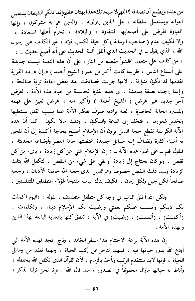 من عنده ويطمع أن نصدقه؟ اللهم لا سبحانك، هذا بهتان عظيم، إنما ذلكم الشيطان يستعمل أعوانه ويستعمل {سُلْطَانُهُ عَلَى الَّذِينَ يَتَوَلَّوْنَهُ وَالَّذِينَ هُمْ بِهِ مُشْرِكُونَ} وإنها الغباوة تفرض على أصحابها الشقاوة، والبلادة، تحرم أهلها السعادة، وإلا فكيف عدم (صاب الرسالة) كل حيلة لكسب قوته، غير الكذب على رسول الله، الذي يقول- في الحديث الذي أتفق أئمة الحديث على أنه أصح حديث-: "من كذب علي متعمدا فليتبوأ مقعده من النار" على أن هذه النغمة ليست جديدة على أسماع الناس، فلربما كانت أكبر من عمر (الشيخ أحمد) فإن هذه الفرية لقدمها قد تكون متوارثة، لأنها جربت فصادفت عند بعض العامة تربة صالحة، وإنما راجت بصفة مدهشة، في هذه الفترة الحاسمة من حياة هذه الأمة، لغرض آخر جديد غير غرض (الشيخ أحمد) وأكبر منه، غرض تعين على فهمه وتفسيره الحالة الحاضرة، لعله يراد به صرف تفكير الأمة عما يسبب القلق لمستغليها وتخدير شعورها، فتخلد إلى الدعة، والسكون، وذلك ما لا يكون. كما أن هذه الآية الكريمة تقطع حجة الذين يرون أن الإسلام أصبح بحاجة أكيدة إلى أن تلحق به أشياء كثيره وتضاف إليه مسائل جديدة اقتضتها حالة العصر وأوضاعه الحديثة، فنقول لهم- على ضوء هذه الآية-: إن الإسلام غني عن كل زيادة، بريء من كل نقص، ولو كان يحتاج إلى زيادة أو بقي على شيء من النقص، لتكفل الله بتلك الزيادة ولسد ذلك النقص خصوصا وهو الدين الذي جعله الله خاتمة الأديان، وجعله صالحا لكل جيل ولكل زمان، فكيف يترك الباب مفتوحا لهؤلاء المتطفلين المتفلسفين.