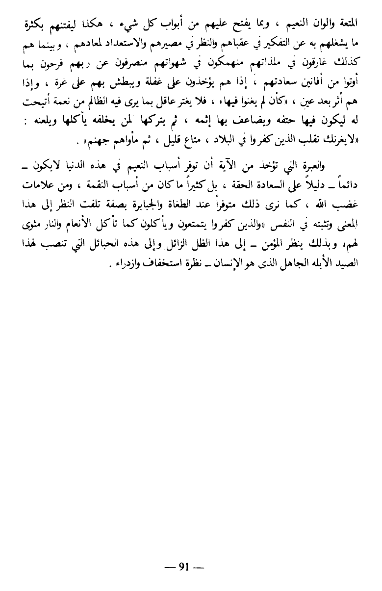 والعبرة التي تؤخذ من الآية أن توفر أسباب النعيم في هذه الدنيا لا يكون- دائما- دليلا على السعادة الحقة، بل كثيرا ما كان من أسباب النقمة، ومن علامات غضب الله، كما نرى ذلك متوفرا عند الطغاة والجبابرة بصفه تلفت النظر إلى هذا المعنى وتثبته في النفس {وَالَّذِينَ كَفَرُوا يَتَمَتَّعُونَ وَيَأْكُلُونَ كَمَا تَأْكُلُ الْأَنْعَامُ وَالنَّارُ مَثْوًى لَهُمْ} وبذلك ينظر المؤمن- إلى هذا الظل الزائل وإلى هذه الحبائل التي تنصب لهذا الصيد الأبله الجاهل الذي هو الإنسان- نظرة استخفاف وأزدراء.