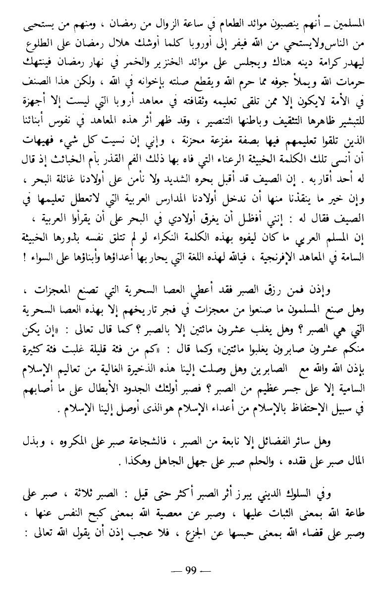 المسلمين- أنهم ينصبون موائد الطعام في ساعة الزوال من رمضان، ومنهم من يستحي من الناس ولا يستحي من الله فيفر إلى أوروبا كلما أوشك هلال رمضان على الطلوع ليهدر كرامة دينه هناك ويجلس على موائد الخنزير والخمر في نهار رمضان فينتهك حرمات الله ويملأ جوفه مما حرم الله ويقطع صلته بإخوانه في الله، ولكن هذا الصنف في الأمة لا يكون إلا ممن تلقى تعليمه وثقافته في معاهد أروبا التي ليست إلا أجهزة للتبشير ظاهرها التثقيف وباطنها التنصير، وقد ظهر أثر هذه المعاهد في نفوس أبنائنا الذين تلقيا تعليمهم فيها بصفة مفزعة محزنه، وإني إن نسيت كل شيء فهيهات أن أنسى تلك الكلمة الخبيثة الرعناء التي فاه بها ذلك الفم القذر بأم الخبائث إذ قال له أحد أقاربه: إن الصيف قد أقبل بحره الشديد ولا نأمن على أولادنا غائلة البحر، وإن خير ما ينقذنا منها أن ندخل أولادنا المدارس العربية التي لا تعطل تعليمها في الصيف فقال له: إنني أفظل أن يغرق أولادي في البحر على أن يقرأوا العربيه، إن المسلم العربي ما كان ليفوه بهذه الكلمة النكراء لو لم تتلق نفسه بذورها الخبيثة السامة في المعاهد الإفرنجية، فيالله لهذه اللغة التي يحاربها أعداؤها وأبناؤها على السواء!
