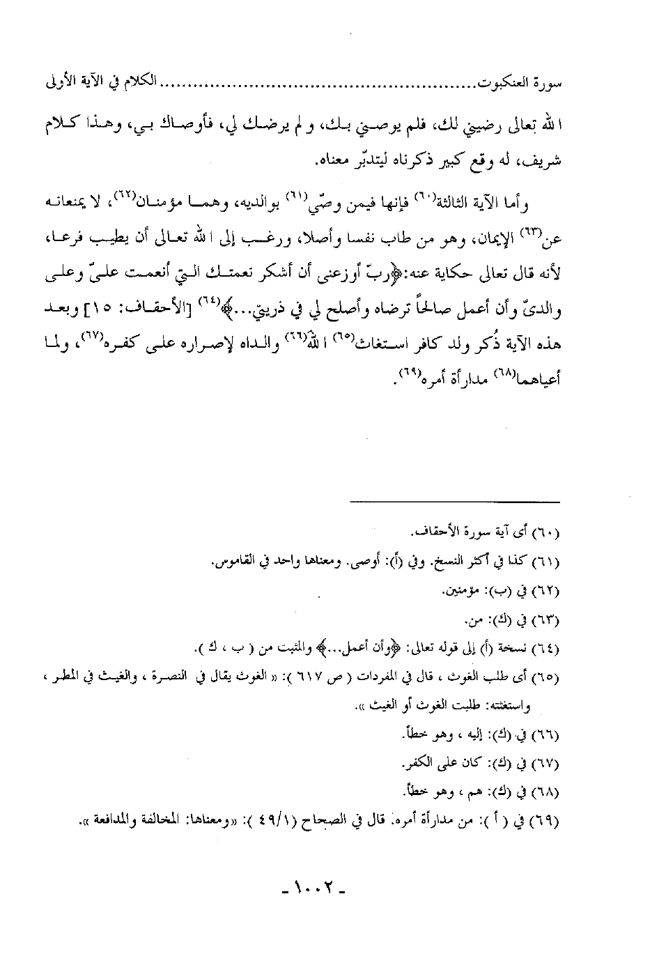وأما الآية الثالثة فإنها فيمن وصّي بوالديه، وهما مؤمنان، لا يمنعانه عن الإيمان، وهو من طاب نفسا وأصلا ورغب إلى الله تعالى أن يطب فرعا، لأنه قال تعالى حكاية عنه: (رَبِّ أَوْزِعْنِي أَنْ أَشْكُرَ نِعْمَتَكَ الَّتِي أَنْعَمْتَ عَلَيَّ وَعَلَى وَالِدَيَّ وَأَنْ أَعْمَلَ صَالِحًا تَرْضَاهُ وَأَصْلِحْ لِي فِي ذُرِّيَّتِي) ، وبعد هذه الآية ذُكر ولد كافر استغاث الله والداه لإصراره على كفره، ولما أعياهما مدارأة أمره.