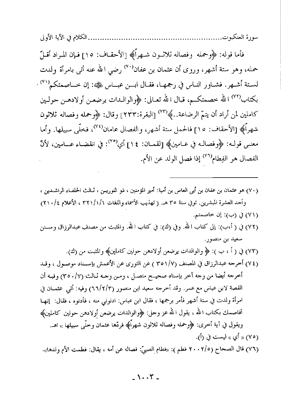 فأما قوله: (وَحَمْلُهُ وَفِصَالُهُ ثَلَاثُونَ شَهْرًا) ، فإن المراد أقلّ حمله، وهو ستة أشهر، وروى أن عثمان بن عفان رضي الله عنه أتى بامرأة ولدت لستة أشهر فشاور الناس في رجمها، فقال ابن عباس - رضي الله عنها -: إن خاصمتكم بكتاب الله خصمتكم قال الله تعالى: (وَالْوَالِدَاتُ يُرْضِعْنَ أَوْلَادَهُنَّ حَوْلَيْنِ كَامِلَيْنِ لِمَنْ أَرَادَ أَنْ يُتِمَّ الرَّضَاعَةَ..)