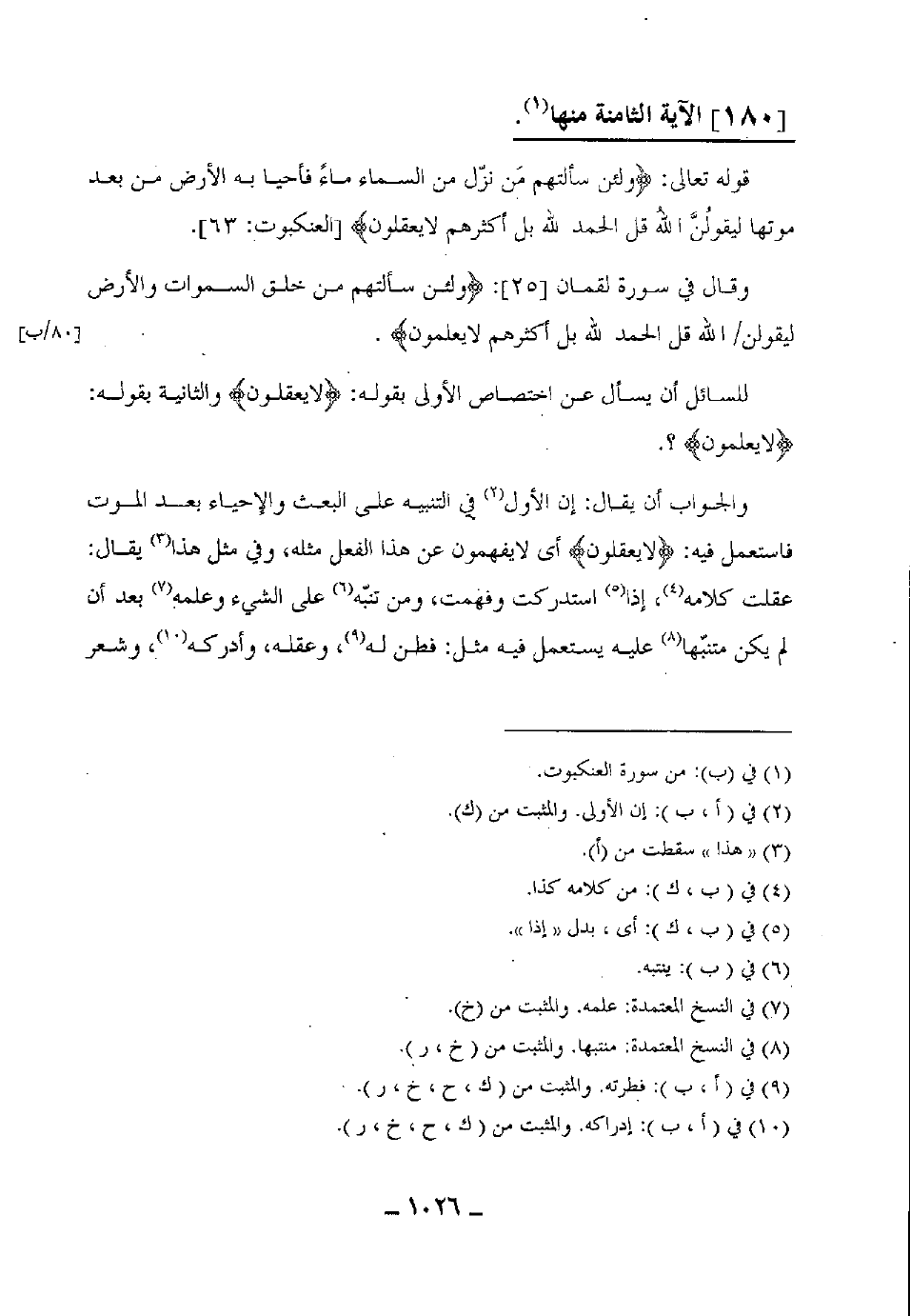 والجواب أن يقال: إن الأول فى التنبيه على البعث والإحياء بعد الموت فاستعمل فيه: (لَا يَعْقِلُونَ) أى: لا يفهمون عن هذا الفعل مثله، وفي مثل هذا يقال: عقلت كلامه، إذا استدركت وفهمت، ومن تنبّه على الشيء وعلمه بعد أن لم يكن متنبّها عليه يستعمل فيه مثل: فطن له، وعقله، وأدركه، وشعر