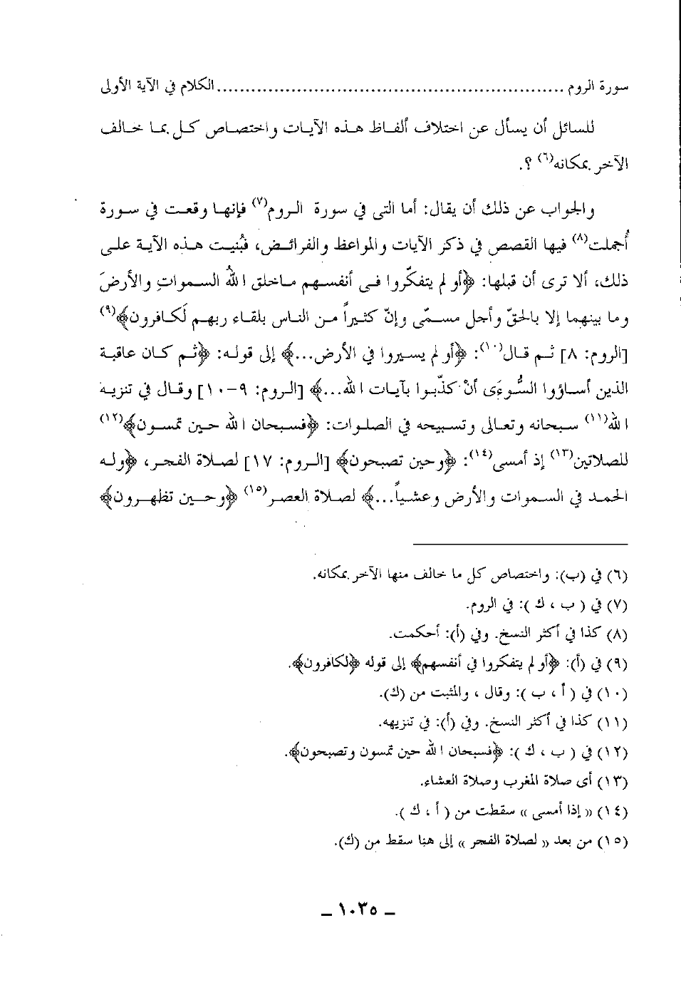 والجواب عن ذلك أن يقال: أما التى في سورة الروم فإنها وقعت في سورة أجملت فيها القصص في ذكر الآيات والمواعظ والفرائص، فبُنيت هذه الآية على ذلك، ألا ترى أن قبلها: (أَوَلَمْ يَتَفَكَّرُوا فِي أَنْفُسِهِمْ مَا خَلَقَ اللَّهُ السَّمَاوَاتِ وَالْأَرْضَ وَمَا بَيْنَهُمَا إِلَّا بِالْحَقِّ وَأَجَلٍ مُسَمًّى وَإِنَّ كَثِيرًا مِنَ النَّاسِ بِلِقَاءِ رَبِّهِمْ لَكَافِرُونَ (8)