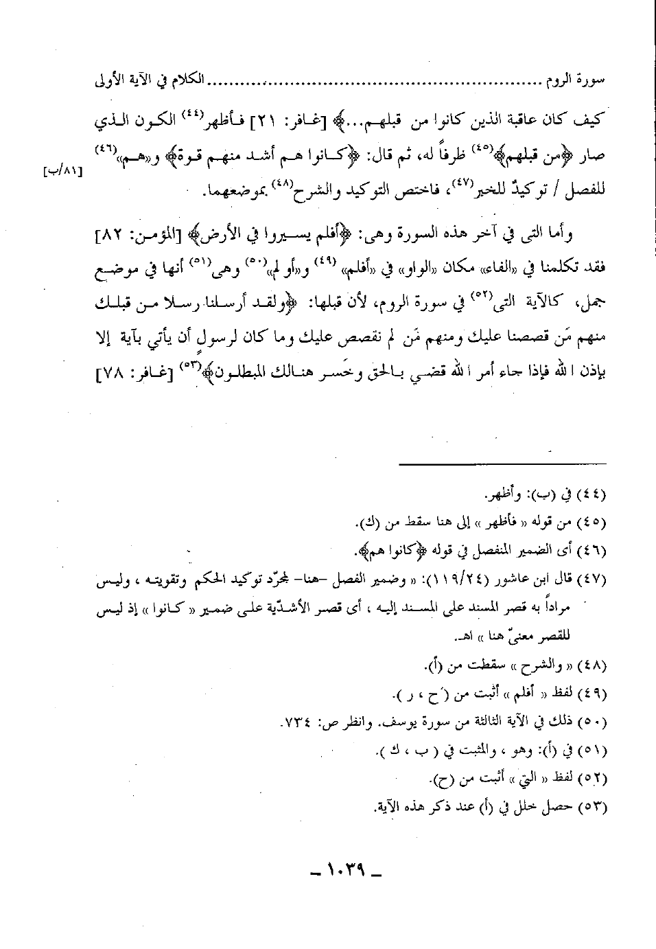 فقد تكلمنا في "الفاء" مكان "الواو"، في "أفلم"، و"أولم" وهى أنها في موضع جمل، كالآية التى في سورة الروم، لأن قبلها: (وَلَقَدْ أَرْسَلْنَا رُسُلًا مِنْ قَبْلِكَ مِنْهُمْ مَنْ قَصَصْنَا عَلَيْكَ وَمِنْهُمْ مَنْ لَمْ نَقْصُصْ عَلَيْكَ وَمَا كَانَ لِرَسُولٍ أَنْ يَأْتِيَ بِآيَةٍ إِلَّا بِإِذْنِ اللَّهِ فَإِذَا جَاءَ أَمْرُ اللَّهِ قُضِيَ بِالْحَقِّ وَخَسِرَ هُنَالِكَ الْمُبْطِلُونَ (78)