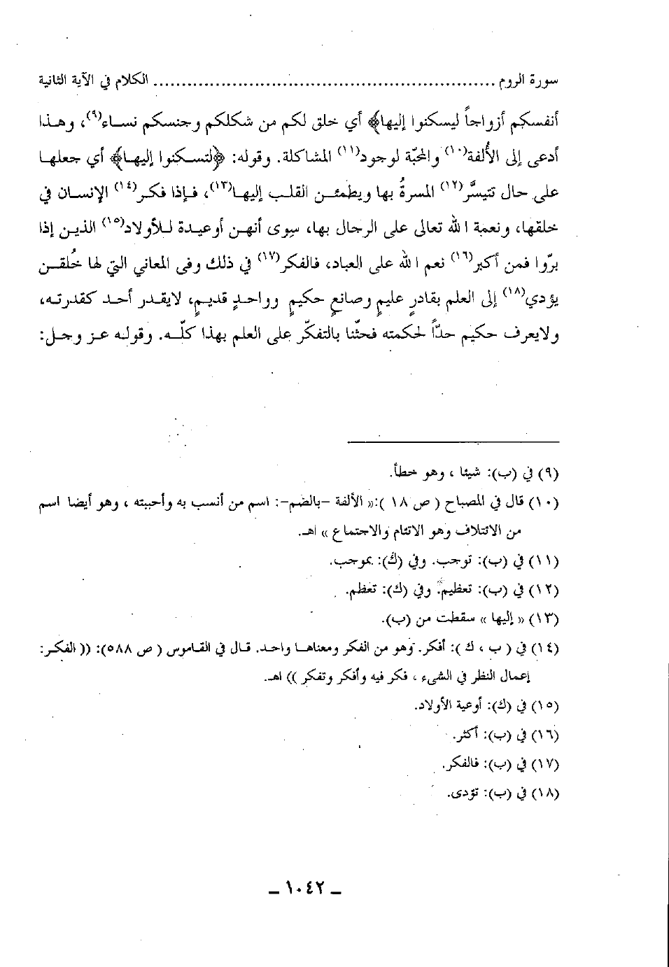 أي خلق لكم من شكلكم وجنسكم نساء، وهذا أدعى إلى الألفة والمحبّة لوجود المشاكلة، وقوله: (لتسكنوا إليها) أي جعلها على حال تتيسر المسرةُ بها ويطمئن القلب إليها، فإذا فكر الإنسان في خلقها، ونعمة الله تعالى على الرجال بها، سِوى أنهن أوعية للأولاد الذين إذا برّوا فمن أكبر نعم الله على العباد، فالفكر في ذلك وفى المعاني التي لها خُلقن يؤدي إلى العلم بقادر عليم وصانع حكيم وواحدٍ قديم لا يقدر أحد كقدرته، ولا يعرف حكيم حدّاً لحكمته فحثّنا بالتفكّر على العلم بهذا كلّه.